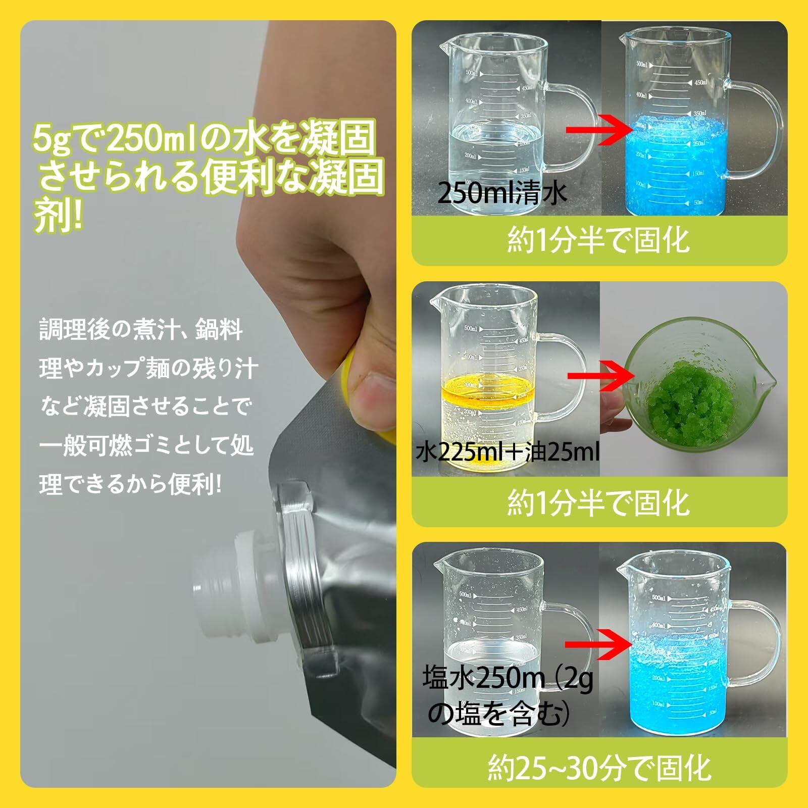 【使用方法】凝固させたい液体の上に本品を適量に入れます。約5g/250m。液体の中に入れて、混ざた後約5-10分静置します。固めしにくい場合、またすこし入れてください。凝固時間はと使用量は液体にある異物の量と塩分により多少異なります。 ※トイレ用なら200回程度、使用可能(1回を250mlと想定)固めたものは、一般の可燃ゴミとして処理可能です。ただし、処理の際にはお住まいの行政自治体の方針に従ってください。