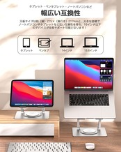 【360°回転式】このノートパソコンスタンドは、台座が360°回転可能な仕様を採用し、ワンプッシュで角度が回転するため、画面を動かさずに手軽に画面を共有することができます。ノートパソコンやタブレットを使用しての商談や説明、授業など、操作しながら画面を見せる際には便利です。
