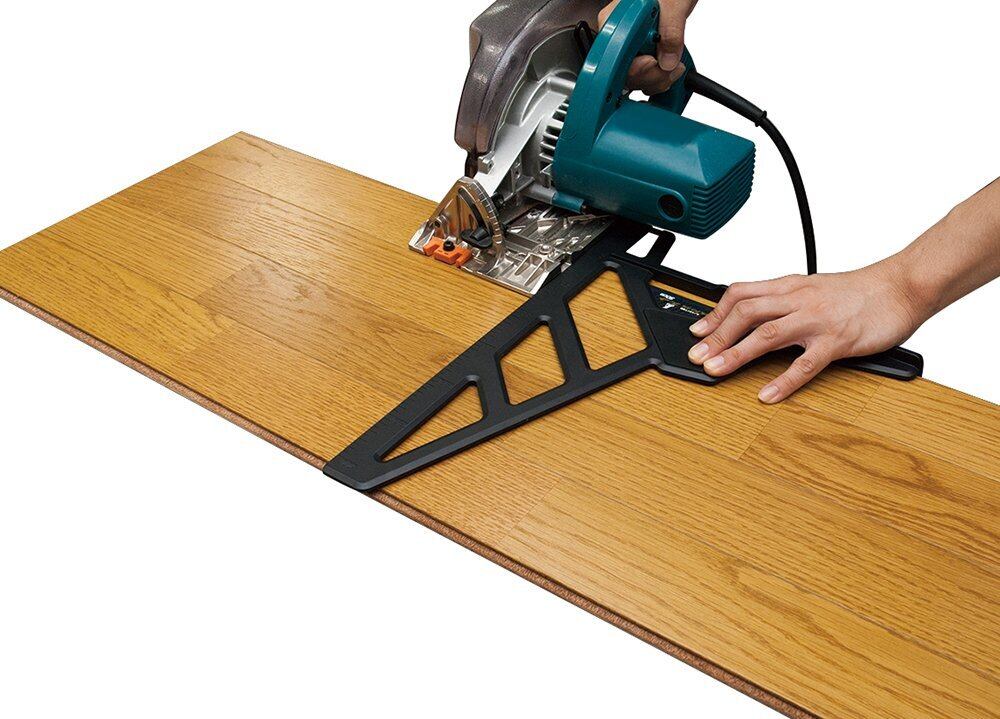 ・ツーバイ材などの面取り材やフロア材などにしっかり突き当てられ、長さも電気丸ノコのモーターを気にせずしっかり固定するスペースを確保