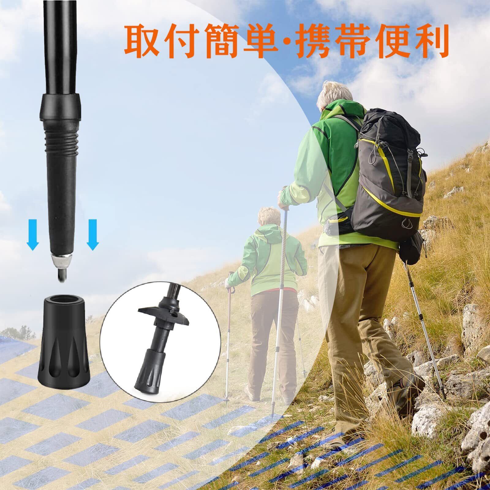 【取付簡単・適用幅が広い】キャップをトレッキングポールの先端に入れるだけで、他の手間が不要、すぐご利用いただけます。登山、ハイキング、トレッキングポール、コンクリート、ダート、ロッキー、マディなど、あらゆる種類の道路状況で使用するトレッキングに最適です。また、路面の保護やトレッキングポール本体のプロテクターとして使用するゴムキャップにもご利用頂けます。