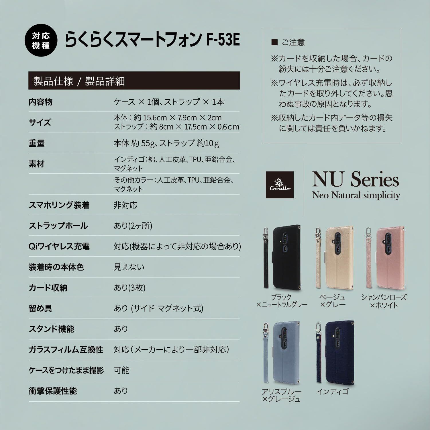 【製品仕様】… ◆ 対応機種 : らくらくスマートフォン F-53E ◆ 内容物 : ケース × 1個、ストラップ × 1本 ◆ サイズ : 約 15.6cm × 7.9cm × 2cm ◆ 重量 : 約 65g ◆ 素材 : インディゴ:綿、人工皮革、TPU、亜鉛合金、マグネット その他カラー:人工皮革、TPU、亜鉛合金、マグネット