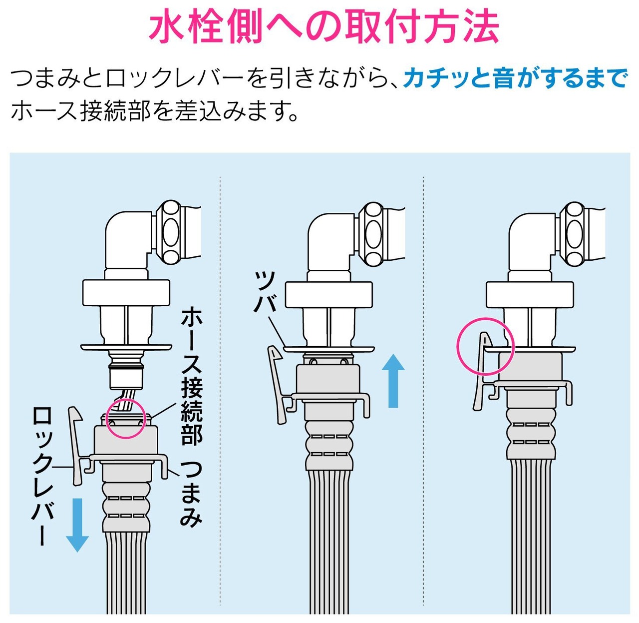 【ワンタッチ接続で、手間いらず!】 : ビス止め式ジョイントが不要なため、特別な工具なしで簡単に取り付けられます。時間がない朝や急なお洗濯時にもすぐに接続でき、効率的に作業を進めることが可能です。