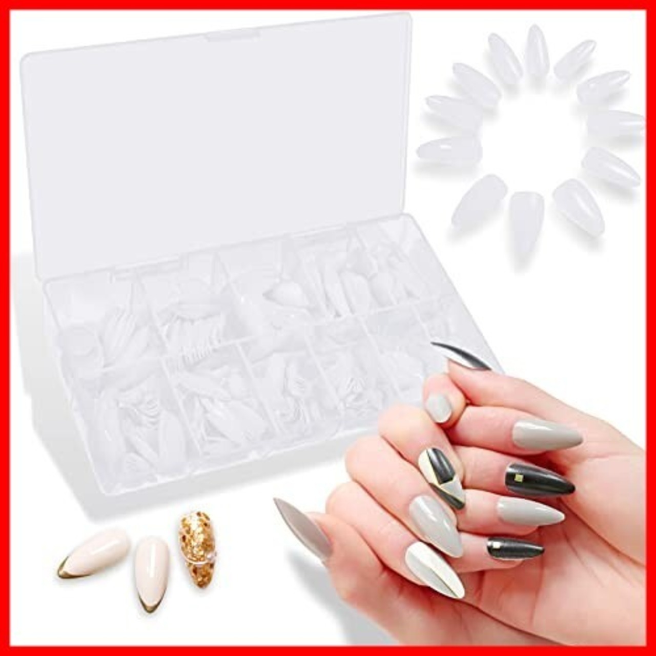 【サイズ別分け】10種類のチップはセット付きのボックスの中で分類されていて、混ざりにくいです。つけ爪自体は半透明の白なので、色んパーツや柄で自由にネイルチップをデコレーションする。