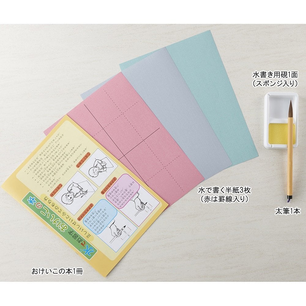 【内容品】 水で書く半紙 黒・緑・赤(罫線入り)各1枚、太筆1本、おけいこの本1冊、水書き用硯1面
