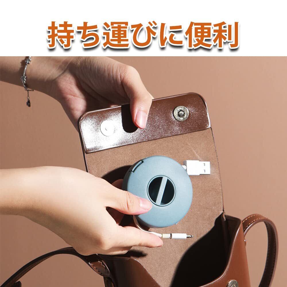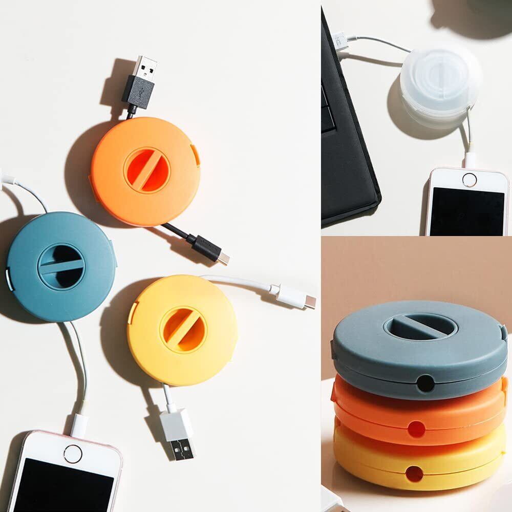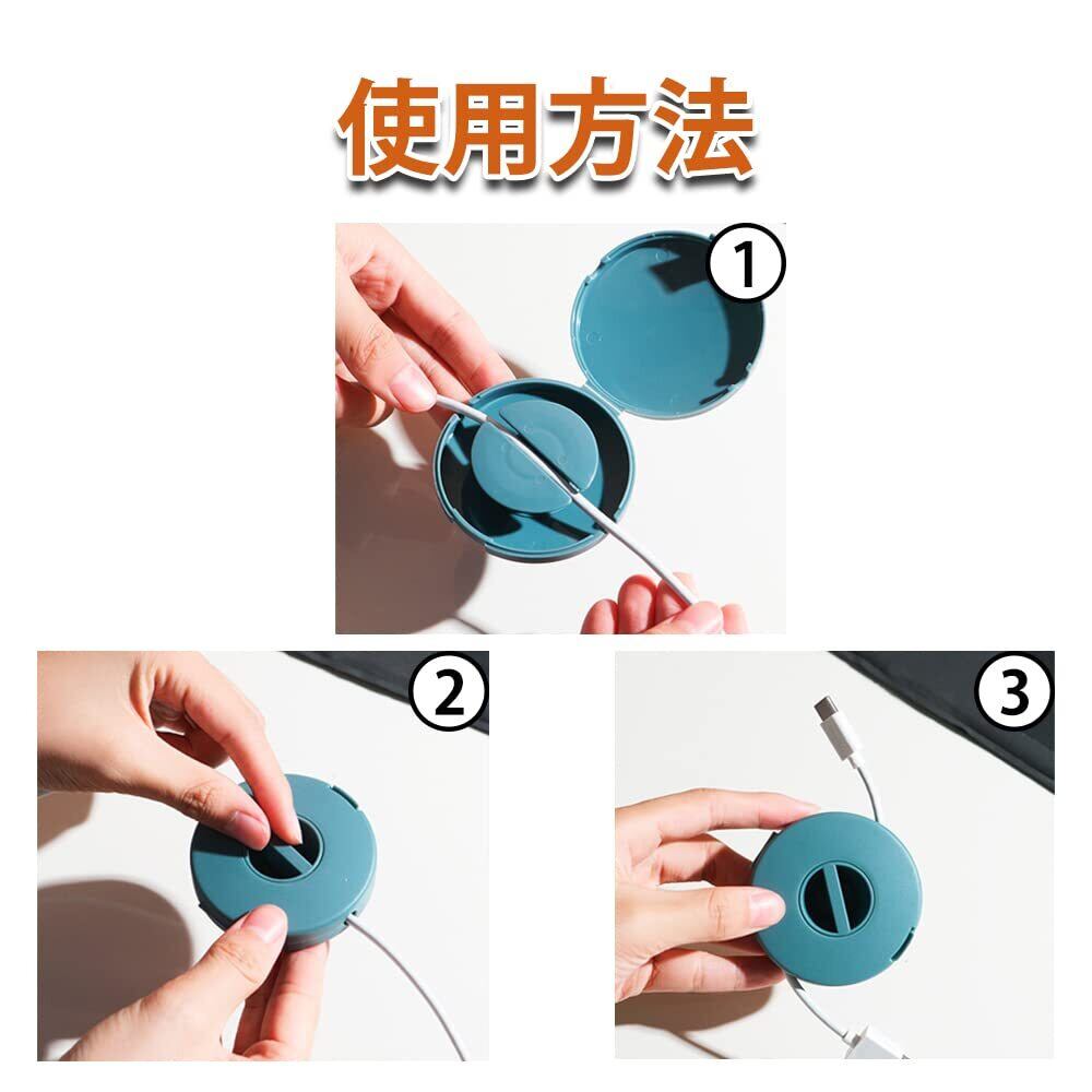 使いやすい:収納ケースを開き、充電コードやイヤホンコードなどの中間部分をケースに入れてフタをし、溝のところを回転させるだけで両端のコードが収まるようにします。