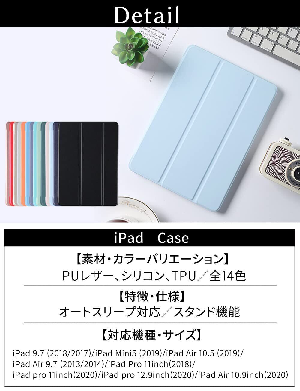 ● 特徴:シンプルなデザイン、三つ折りスタンド、耐衝撃性、オートスリープ機能