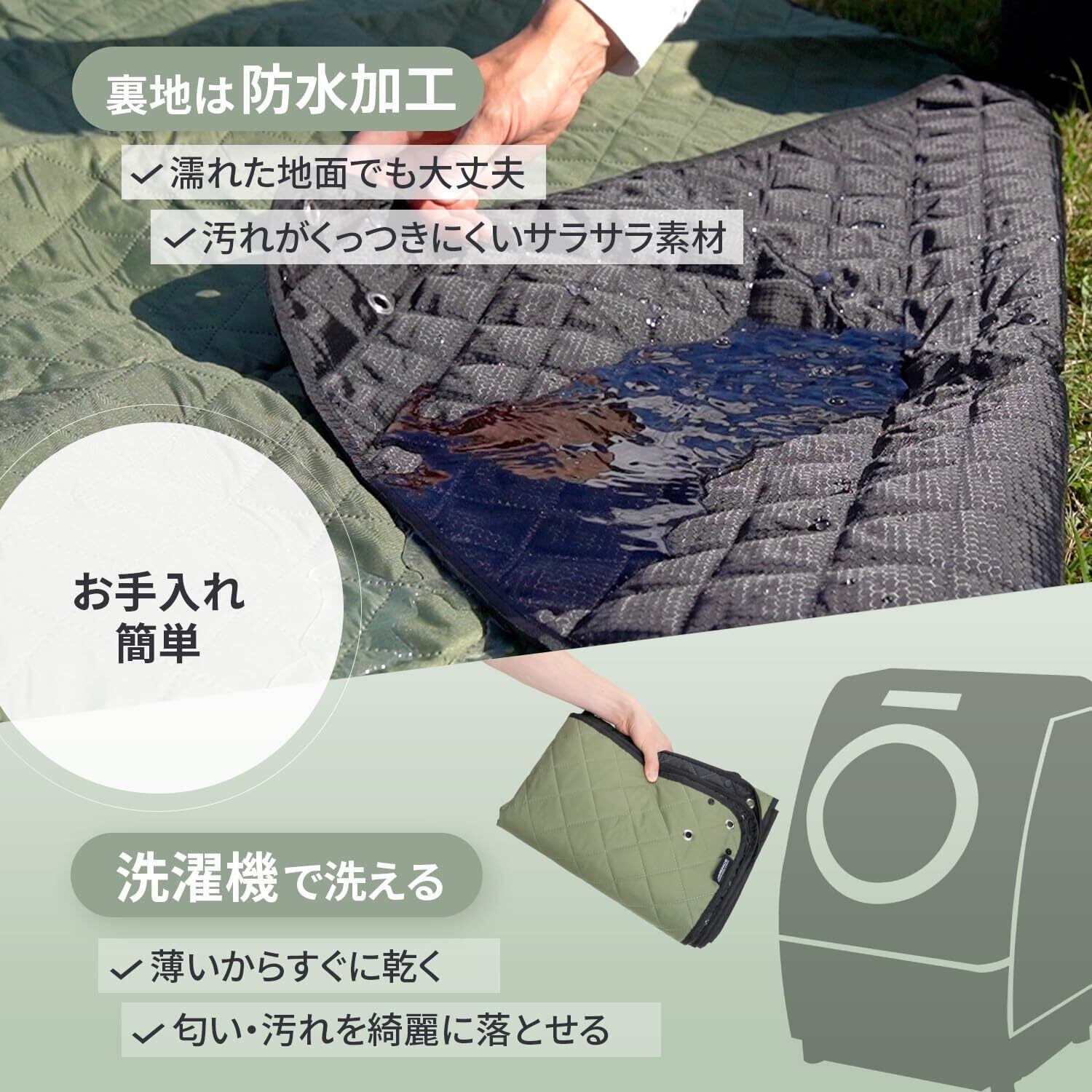 【素材】表面:シャリシャリの心地良い肌触りで通気性が良く、汗をかいた素肌で触れても”ぬるっ”としません。/中綿:中綿を詰めていますので軽度のクッション性があります。スポンジに比べて畳みやすく、通気性も良いのが特徴です。/裏面:防水加工(PUコーティング)を施していますので水たまりの上に敷いても染みません。ピクニックや日帰りレジャーならこれ1枚でOKです。