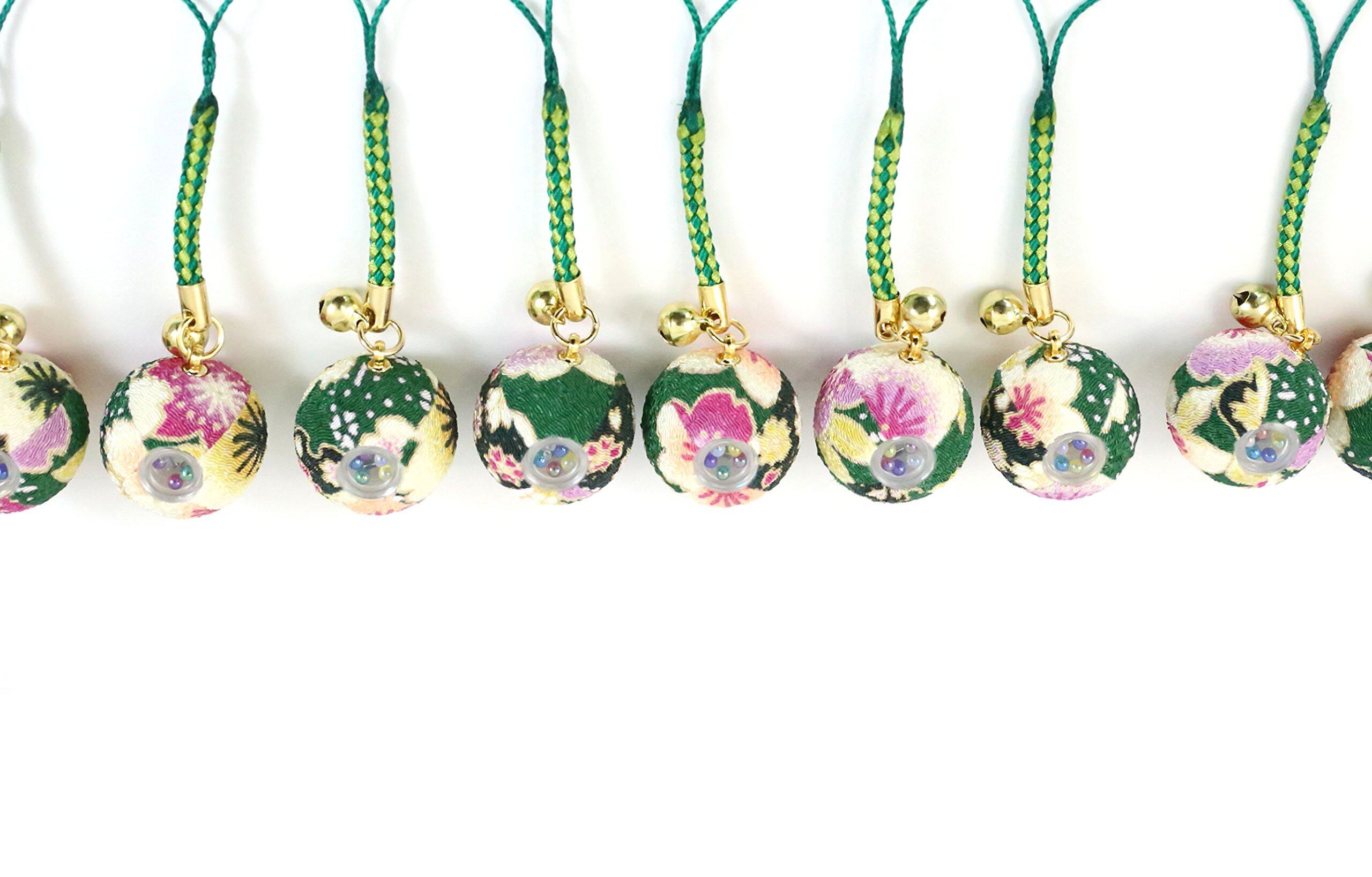 美しい和柄の布で包んだ小さな万華鏡のチャーム。万華鏡(球体)の穴をのぞけばカラフルなガラス玉が光に反射して癒されます!!※球体を動かしたり、コツコツ叩くとガラス玉が動いてより綺麗です。万華鏡は球体(直径25㎜)で、鈴付きなのでお家の鍵やお財布にもピッタリ! 球体をしぼが特徴のちりめん(縮緬)生地で包みました。和柄が醸しだすエレガント&キュートな装いと、ちりめん生地独特の風合いが楽しめます。 世界中で愛される和柄のちりめん生地を使用した小さな万華鏡は日本で作られたもので、海外の人へのお土産・プレゼントにも最適。 職人による手作りのため品質には多少の違いがあります。また、図柄のパターンは商品ごとに異なりますので、ご了承願います。