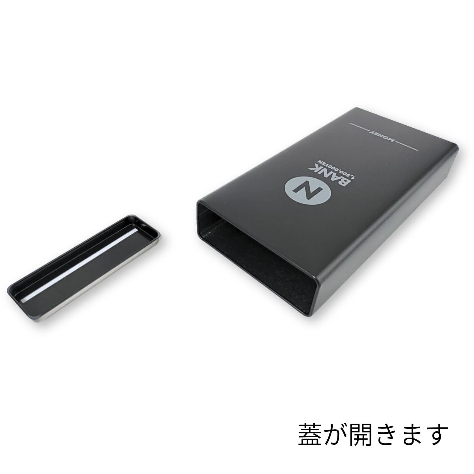 お札専用の貯金箱。150枚収納可能で、1,000円札で15万円、10,000円札で150万円貯められます。