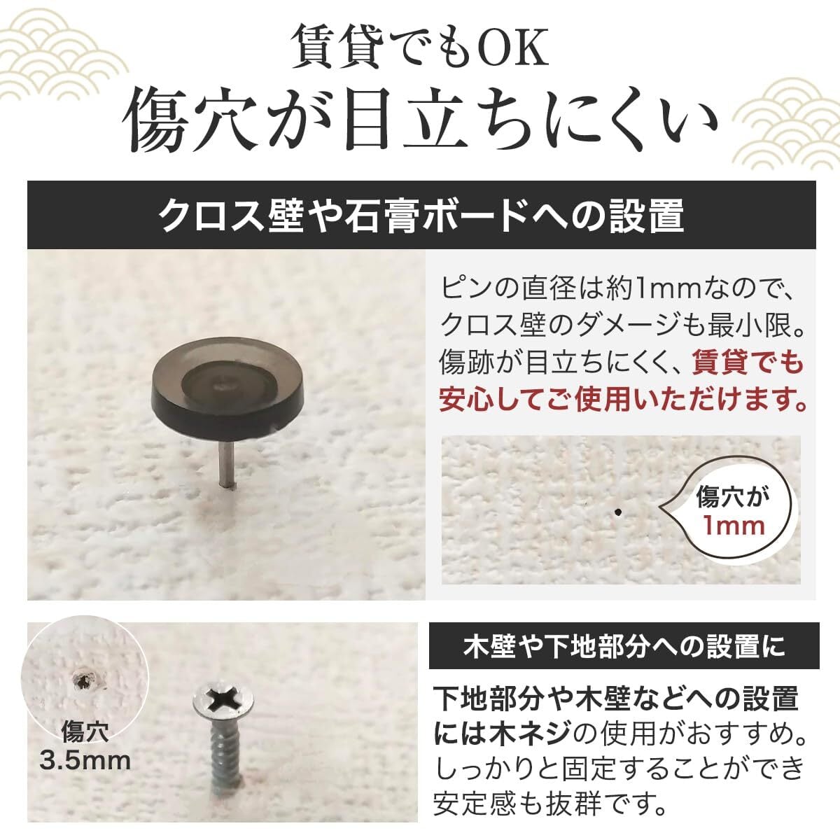 賃貸住宅で使用可能な1㎜穴での固定が可能なピンと、3.5㎜穴でしっかり固定する木ネジの2タイプが付属。大きな傷跡を残さないように配慮しています。 一般住宅で多い石膏ボード壁ではピンをご使用下さい。