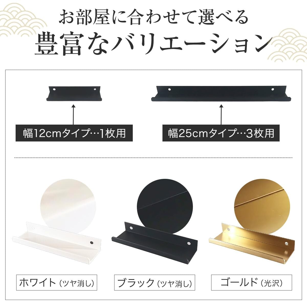 1枚用の12㎝幅と3枚用の25㎝幅の2サイズ展開。 色はホワイト、ゴールド、ブラックの3色。ホワイトとブラックはマットな質感、ゴールドは落ち着きのある上品な輝きをたたえます。いずれもシンプルでモダンなリビングルームにマッチします。