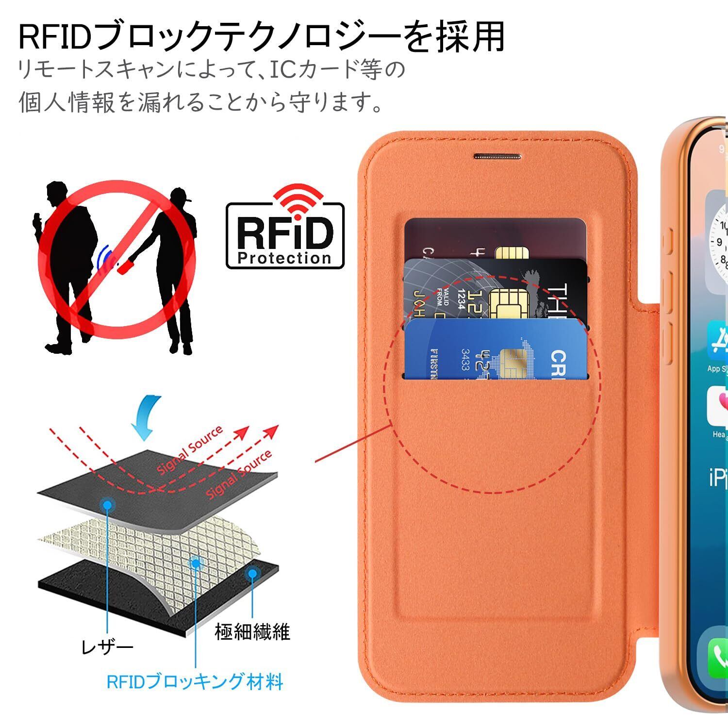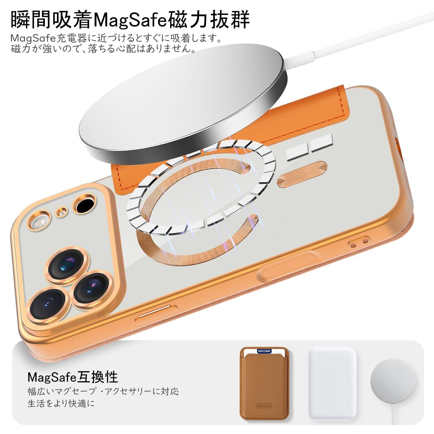 ● 特徴:クリアな背面とオレンジのデザインが魅力的で、手帳型の機能性を備えたスマホケース。MagSafe対応で、ワイヤレス充電やカード収納が可能なスタイリッシュな一品!