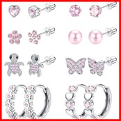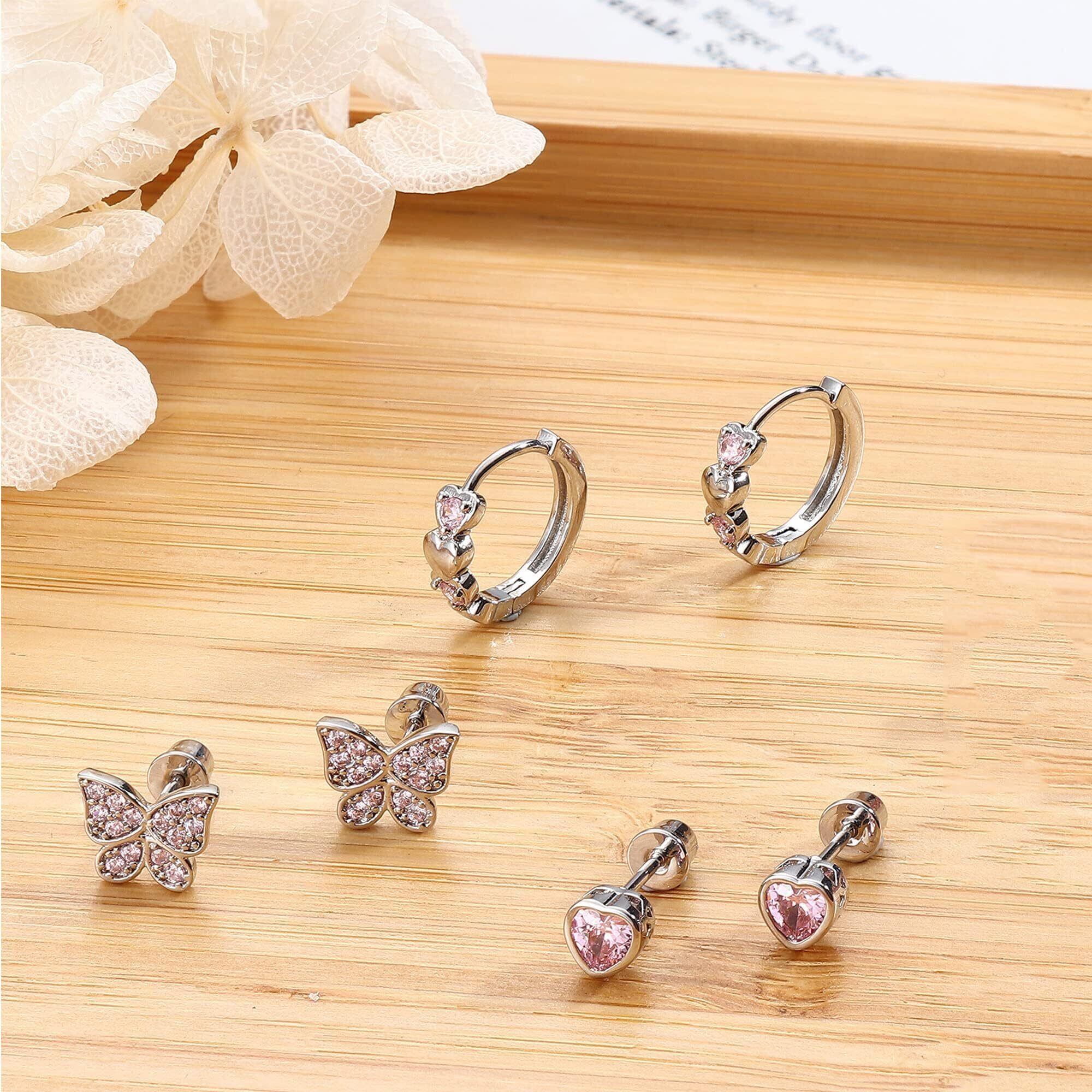 Jerywe 8-10ペア女性のためのハイポアレルギーネジバックイヤリング316Lステンレス鋼ハートCZフラワーバタフライネジスタッドイヤリングかわいいフープイヤリングセット20g