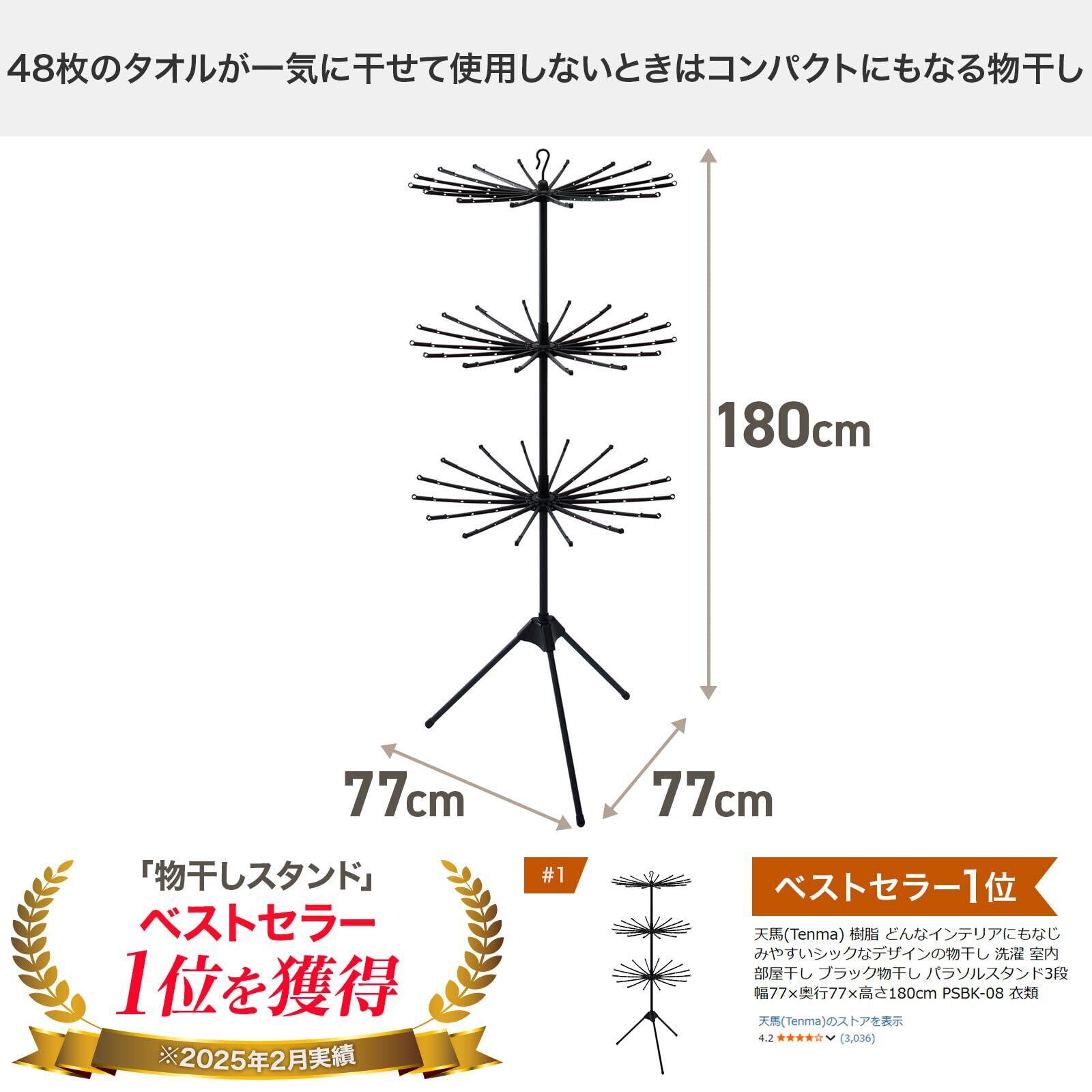 天馬(Tenma) 樹脂 どんなインテリアにもなじみやすいシックなデザインの物干し 洗濯 室内 部屋干し ブラック物干し パラソルスタンド3段 幅77×奥行77×高さ180cm PSBK-08 衣類 | hananoki