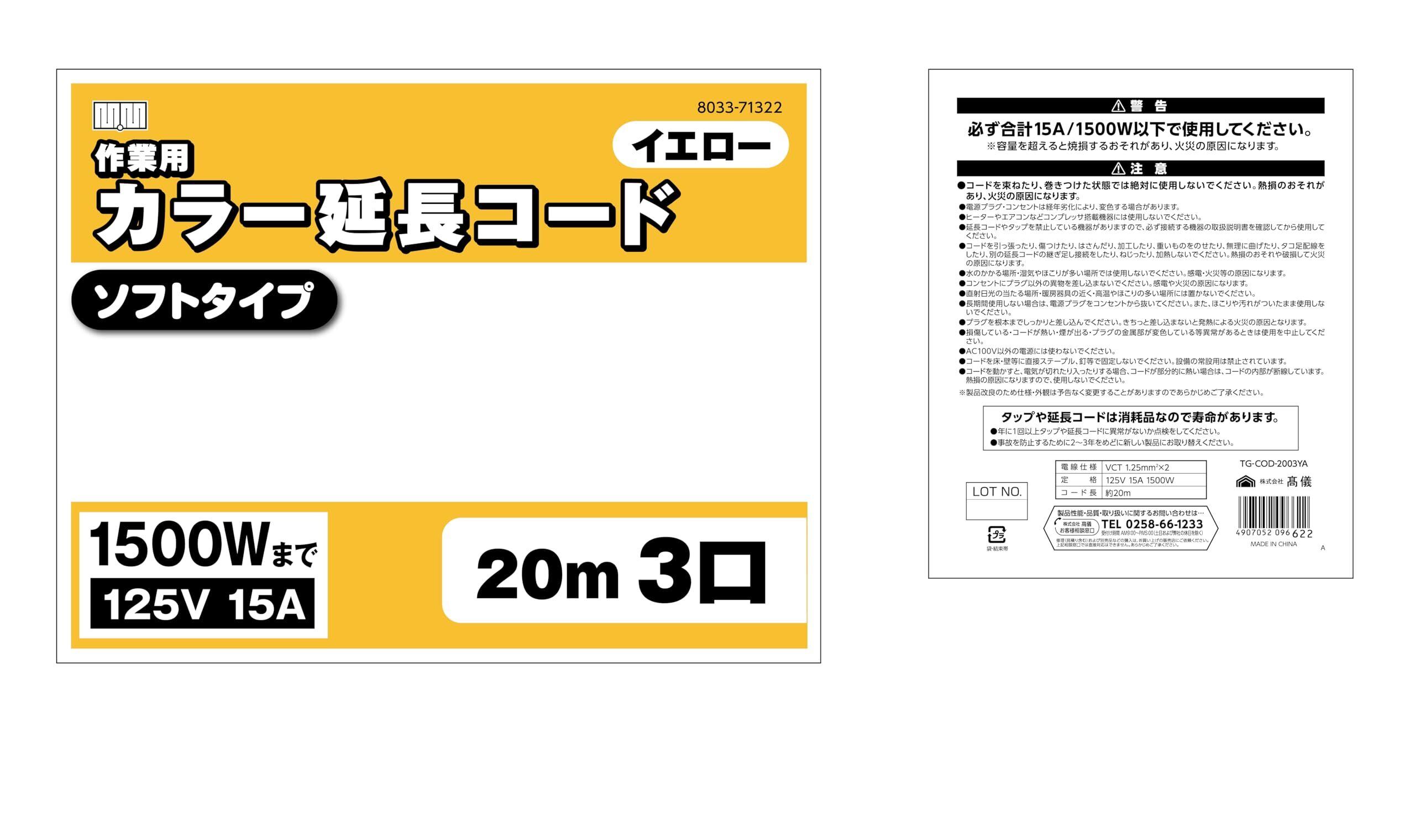 高儀(Takagi) M.M 延長コード 電源ケーブル 延長ケーブル 電源タップ トリプルタップ 電源コード 作業用 カラー ソフトタイプ 3口 1500Wまで 125V 15A 3個口 3分配 黄色コンセント コンセント たこあし 延長電源 電工 20m イエロー TG-COD-2003YA