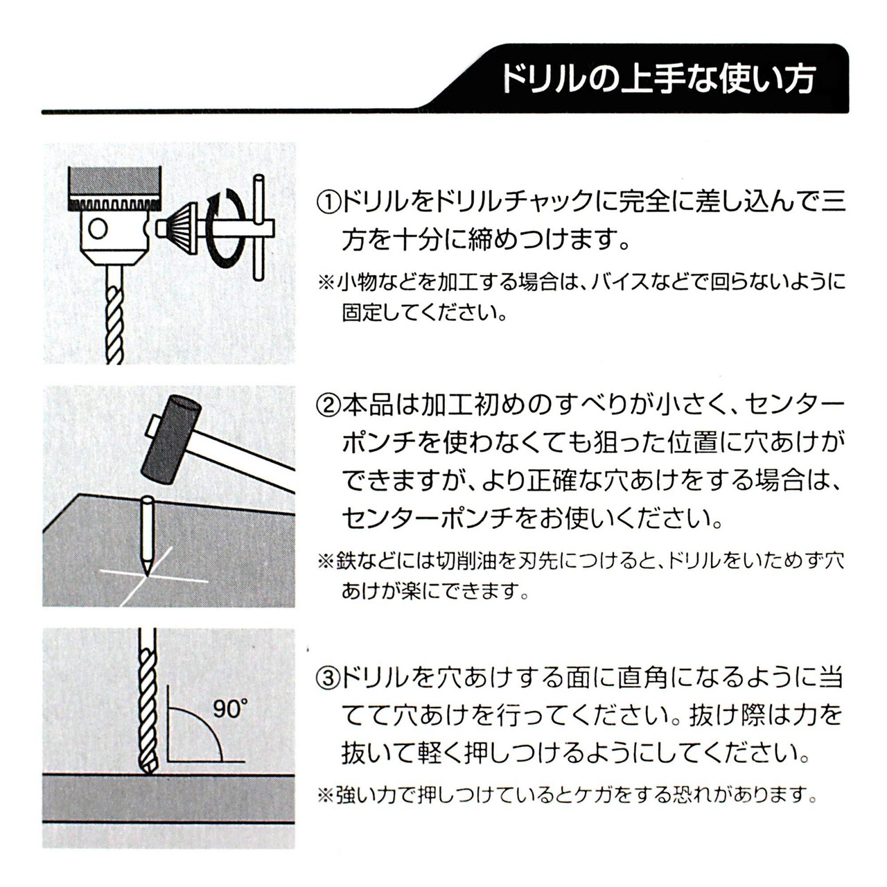【高品質な素材で耐久性抜群!】 : このドリルは高品質な素材を使用しており、長持ちする耐久性が魅力です。鋭い先端によりスムーズな穴あけが可能で、効率的な作業をサポートします。特に鉄材に対する切れ味が優れており、業務用にも適した性能を発揮します。
