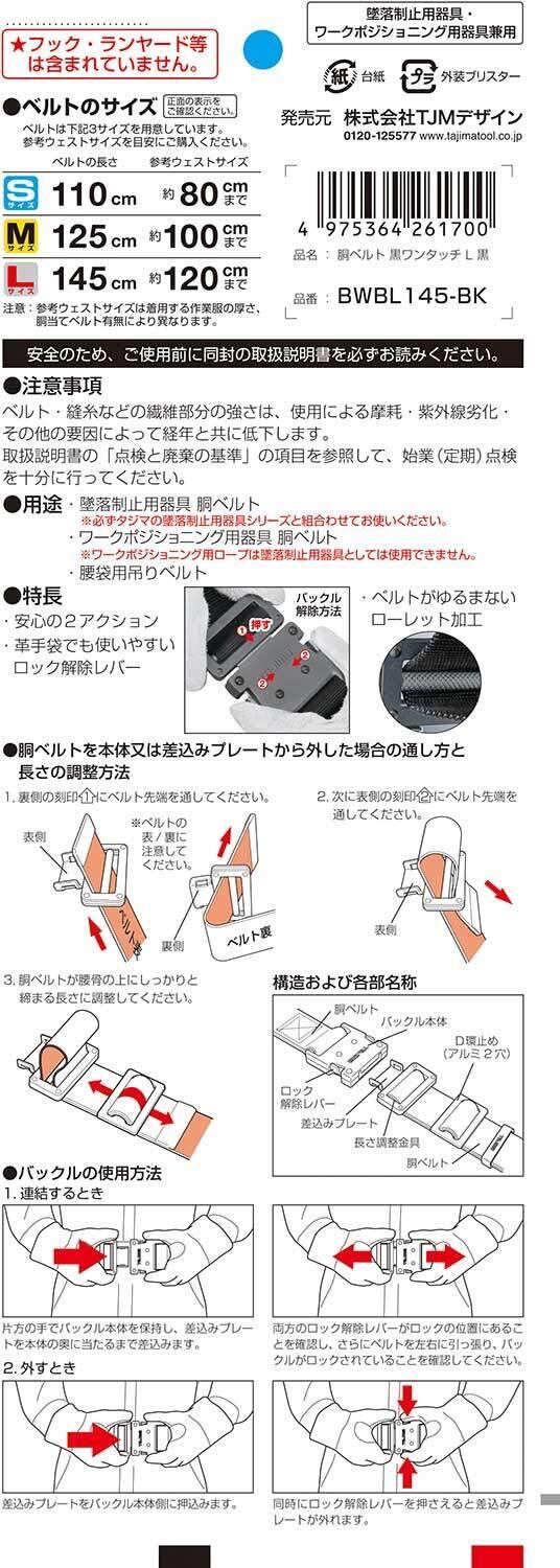 タジマ 新規格安全帯 胴ベルトLサイズ 黒 BWBL145-BK 長さ145cm 衝撃や耐久に強い鍛造ワンタッチ黒バックル 腰の強い特厚ナイロンベルト