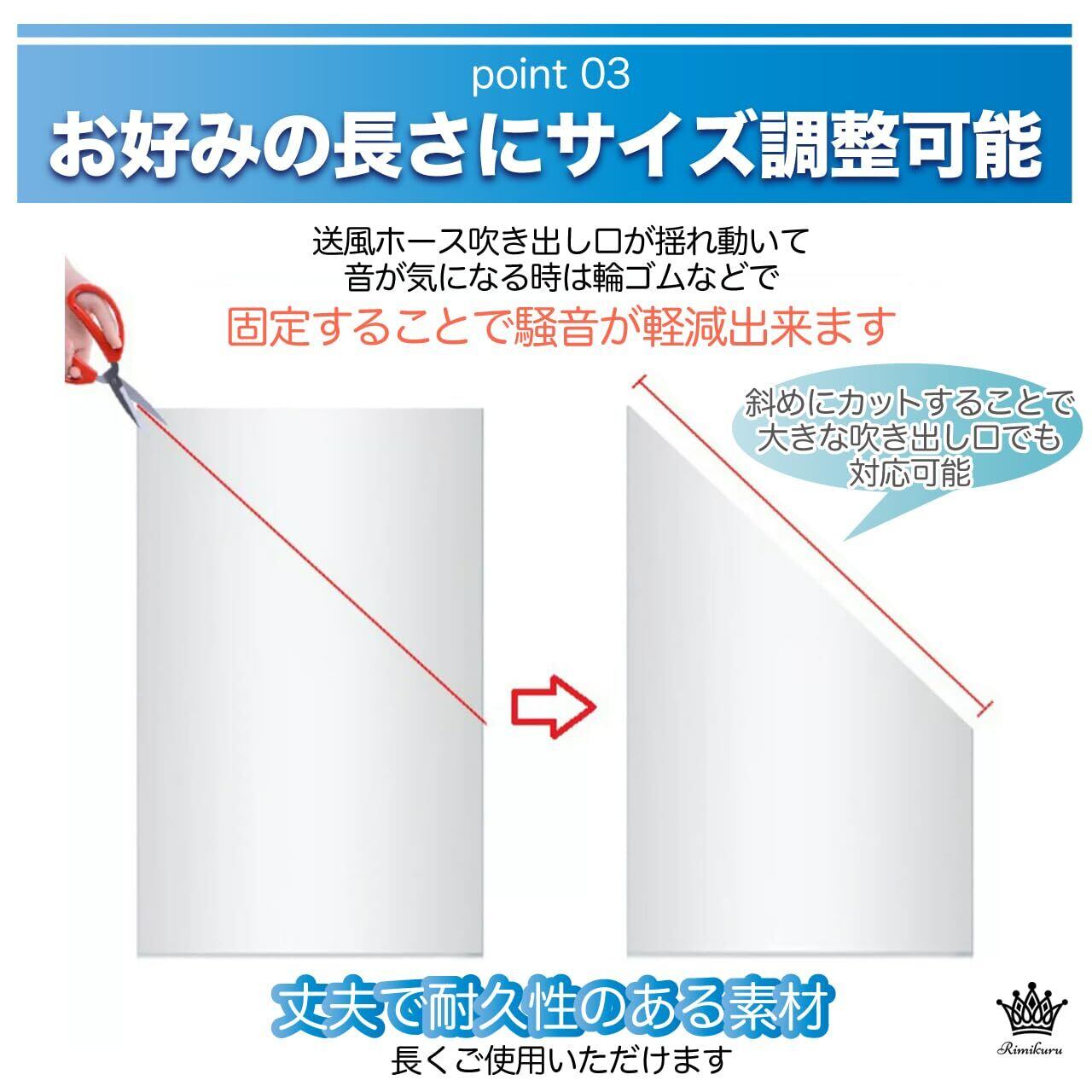 お好みの長さにサイズ調整可能:こちらのエアコン 送風ホース 隣の部屋まで届く ダクトホースはポリエチレン(PE)素材でお好みの長さに送風ホースを簡単にカットすることがでサイズ調整が可能です。またエアコンの強風モードで送風ホース吹き出し口がフラフラ揺れ動いて音が気になる時は輪ゴムなどで固定することで騒音が軽減出来ます。また、丈夫で耐久性のある素材なので、長くご使用いただけます。