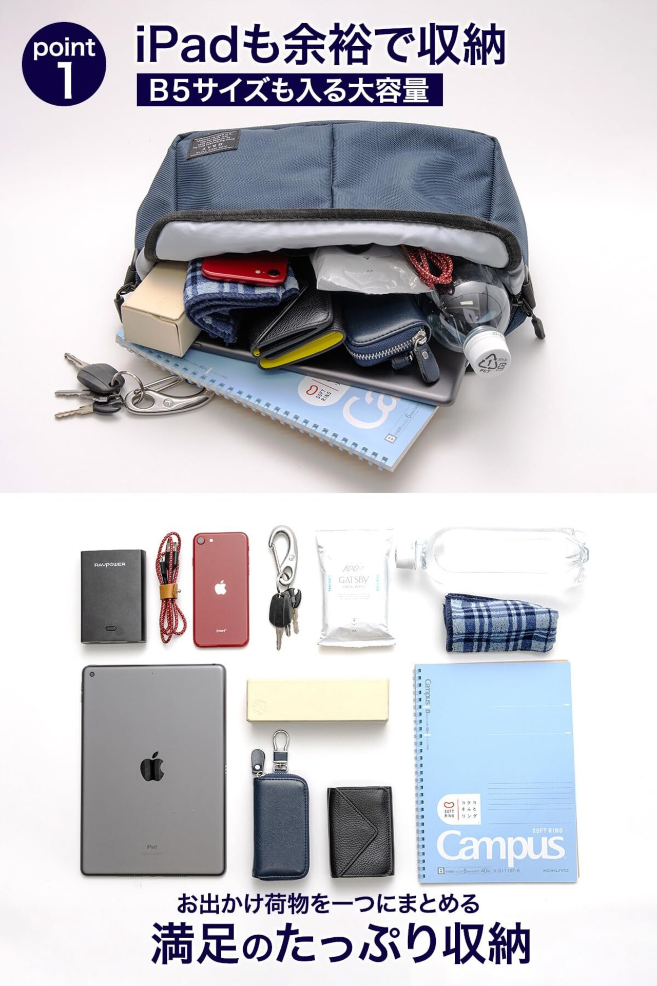 【収納力も機能性もちょうどいい。ジャストサイズのショルダーバッグ】 プライベートにも仕事にも、iPadも余裕で入るちょうどいいサイズ! iPadやB5サイズのノートが入るゆったりサイズのショルダーバッグ。 フラップ付きで、スタイリッシュに! 急な雨でも、フラップが大事な荷物を守ります。 オフィスでも街歩きでもシーンを選ばないシンプルな3色展開。 毎日使うモノを入れておけば、ちょっとそこまでが今までより楽しく便利に!