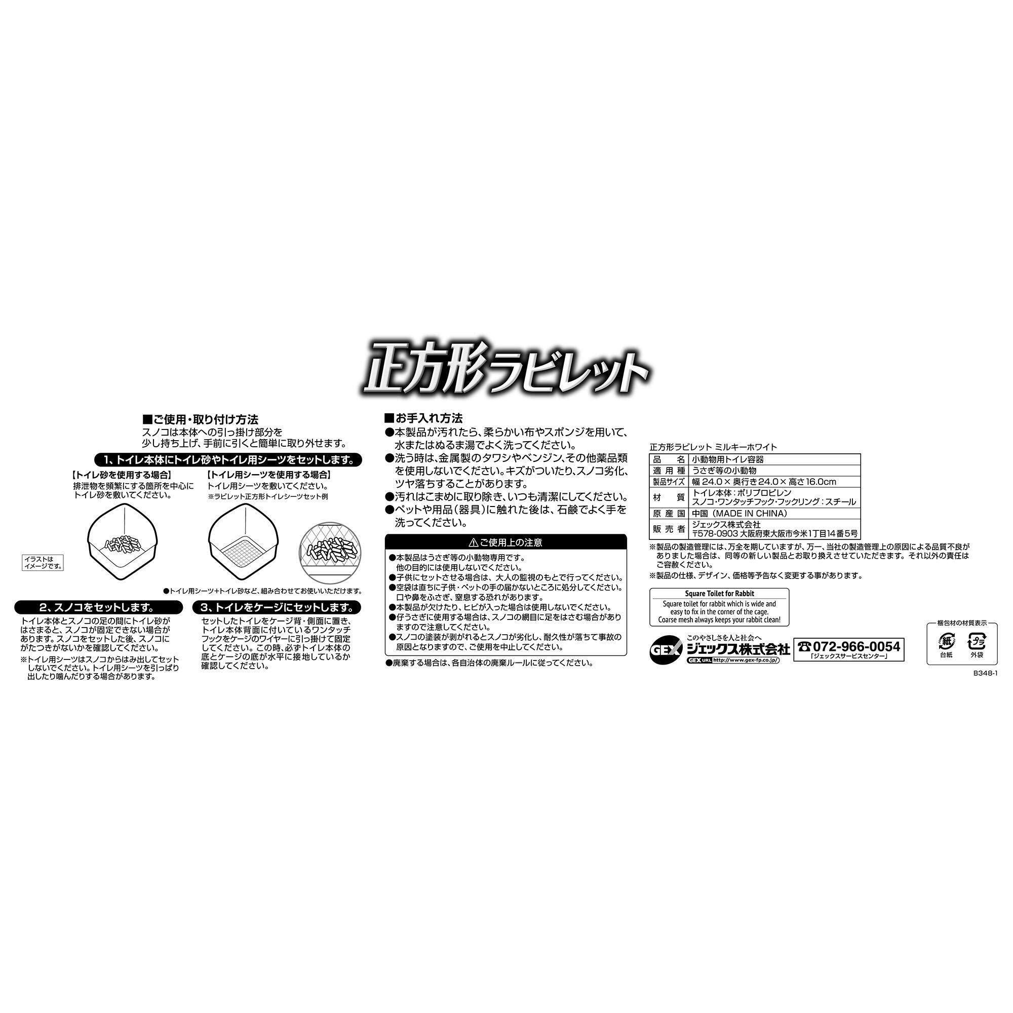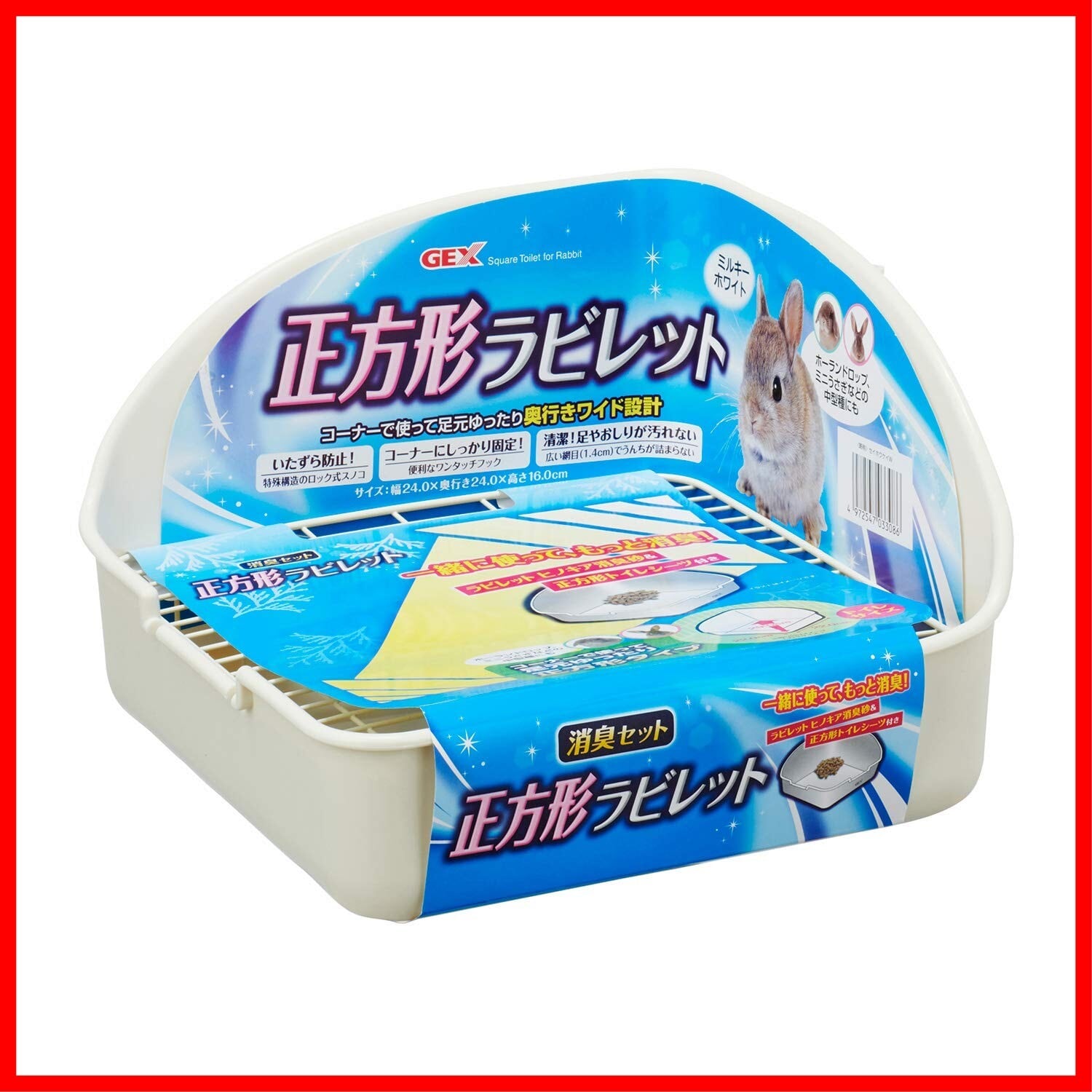 中型うさぎにピッタリのコーナー型トイレ! コーナーで使って足元ゆったり奥行きワイド設計! ホーランドロップ、ミニうさぎなどの中型種にも最適。 すぐに使える「ヒノキア 正方形ラビレット 専用トイレシーツ お試し2枚」+「ヒノキア消臭砂」試供品が付いた消臭セット。 いたずら防止! 特殊構造のロック式スノコ ケージにしっかり固定! 便利なワンタッチフック付き 清潔!足やお尻が汚れない! 広い網目(1.4cm)でうんちが詰まらない※仔うさぎに使用する場合は、スノコの網目に足を挟む場合があるので注意してください。 トイレサイズ:幅24.0×奥行24.0×高さ16.0cm
