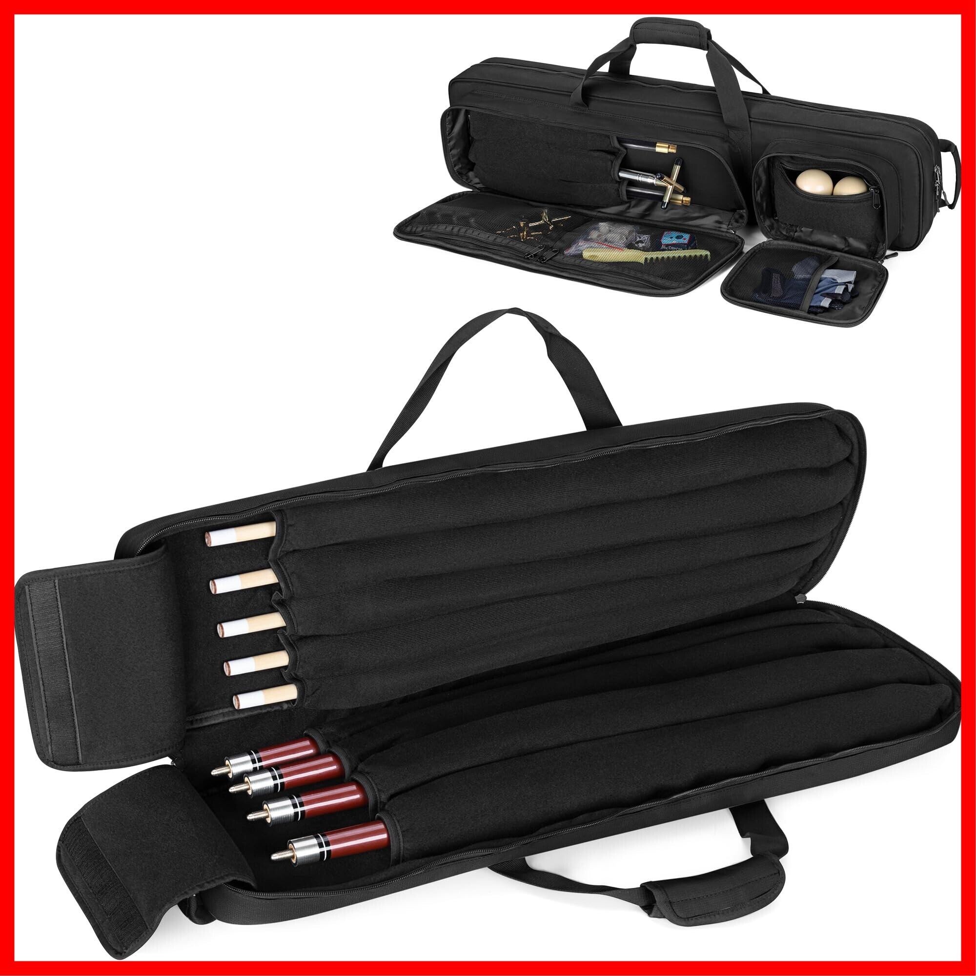 【収納力抜群】プールキューケースには、フラップ開閉式の完全にパッド入りの保護バッグが個別に付属しており、バット4本とシャフト5本を収納できます。柔らかいパッド入りの裏地がプールキューを損傷から保護します。