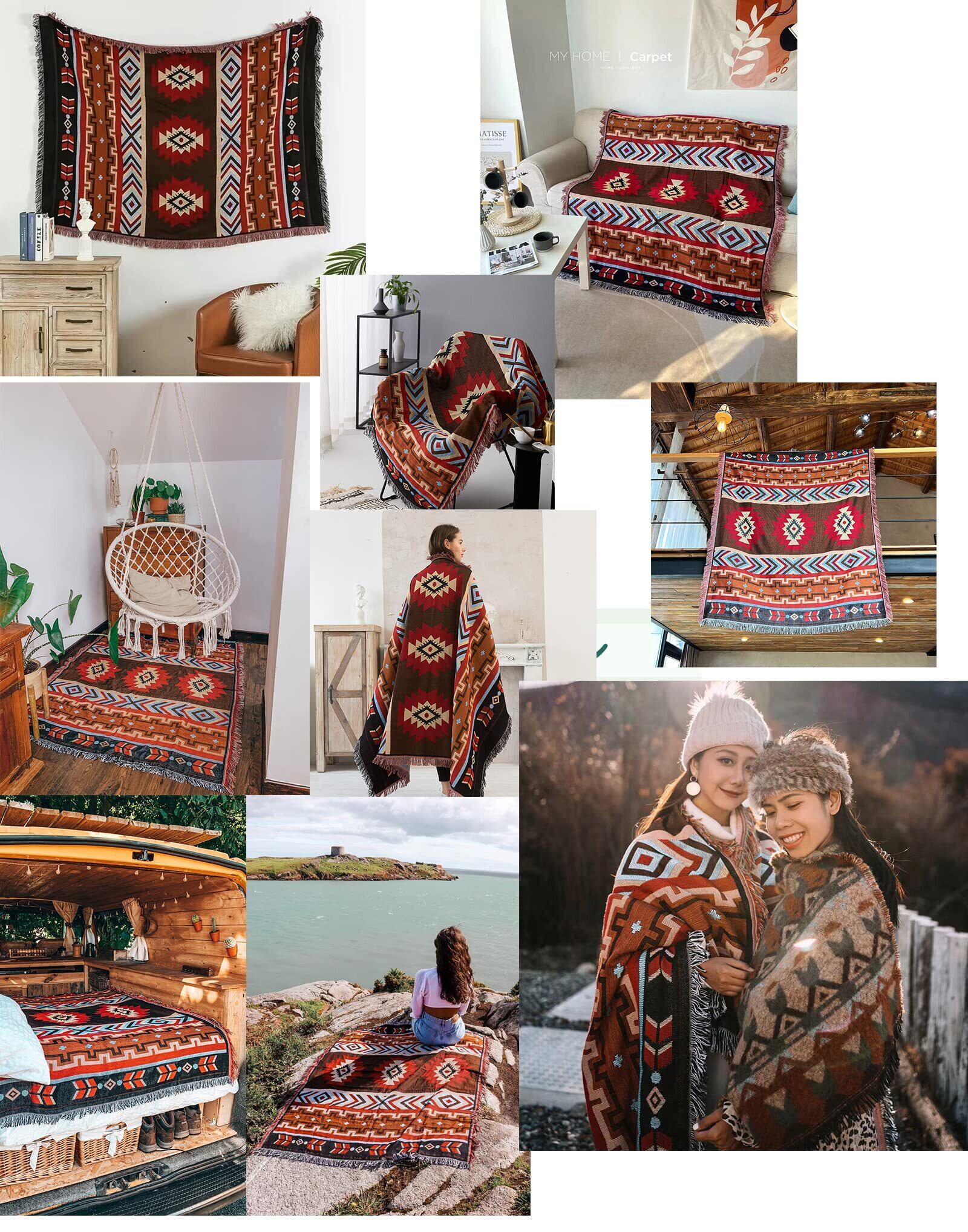 【おしゃれなデザイン】チェコのボヘミア地方の民族衣装に由来し、自由奔放な生活を送るジプシーのファッションや民族衣装を取り入れたスタイルを採用したブランケットは色もフリンジもジプシー人の放浪な感じを溢れられます。男女老若問わず好かれる柄です。