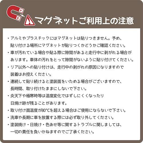 【マグネットご利用上の注意】 ◆アルミやプラスチックにはマグネットは貼りつきません。予め貼り付ける場所にマグネットが貼りつくかどうかご確認ください。 ◆車が汚れている場合や貼る際に隙間があると走行中に剥がれる場合があります。 ◆連続して貼り続けると塗装面をいためる場合がございますので、長時間、取り付けたままにしないで下さい。 ◆炎天下や極寒時等は温度変化ではずしにくくなったり日焼け跡が残ることがあります。 ◆洗車や長期に車を放置する際には必ず取り外してください。 ◆塗装焼け・日焼け・色あせ等に関するトラブルに関しましては、一切の責任を負いかねますのでご了承ください。