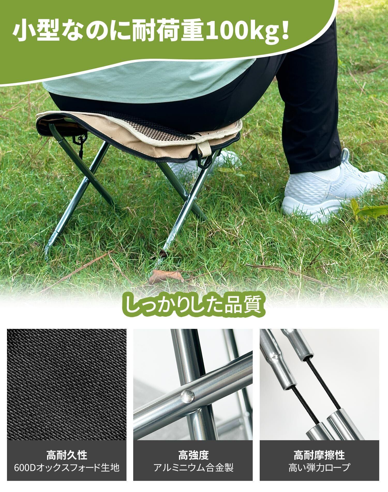 【 最大100kg耐荷重!安心の強度 】 小さくてもパワフル!アルミ合金フレームと600Dオックスフォード生地を採用し、耐荷重はなんと100kg。大人も子どもも安心して使えるコンパクト折りたたみ椅子です。