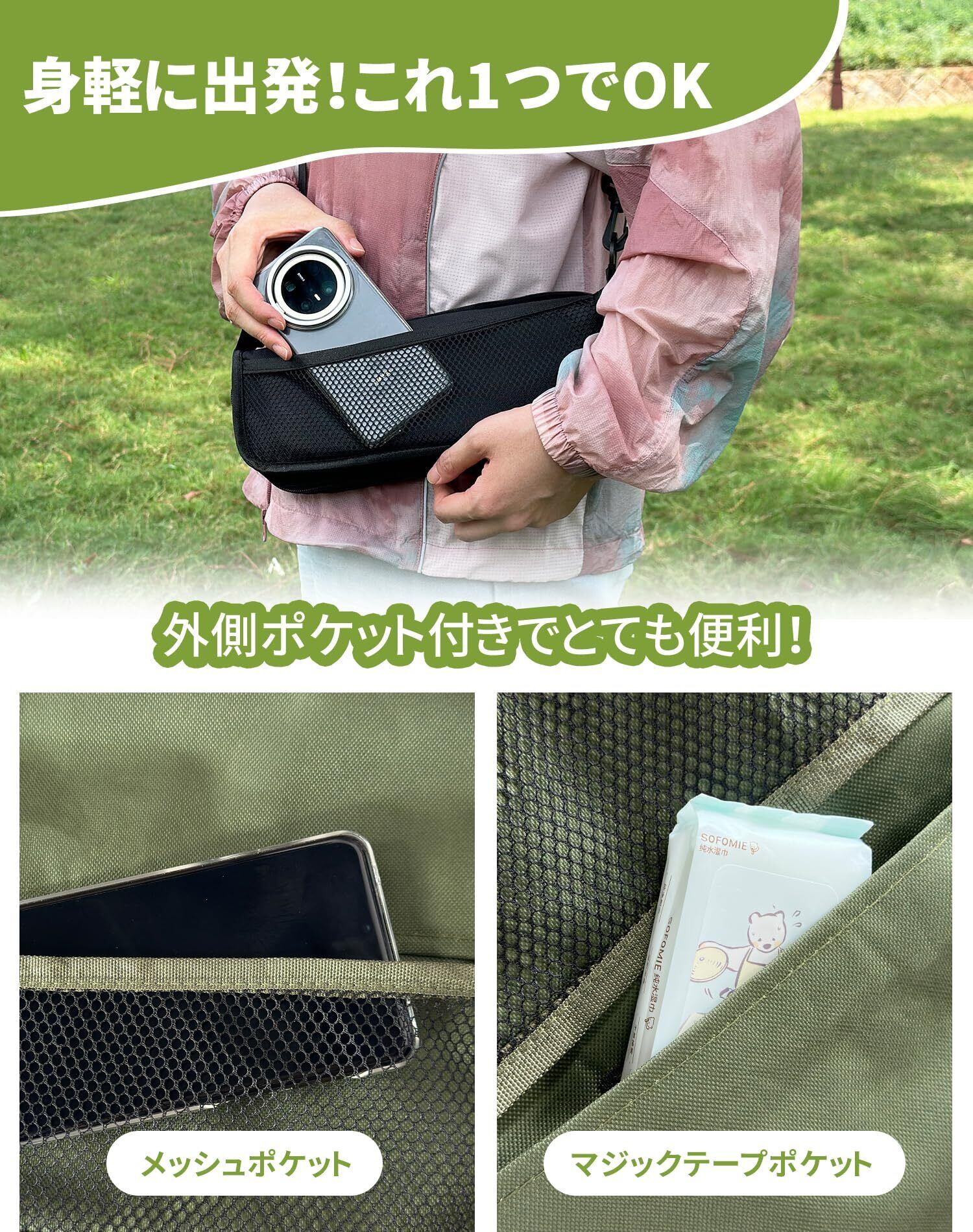 【 バッグいらず!便利な収納ポケット 】 座面にポケット付き。メッシュポケットはサッと取り出しやすく、布製ポケットはマジックテープ付きでスマホやティッシュをしっかり収納。出かけるときはこの1つで十分!
