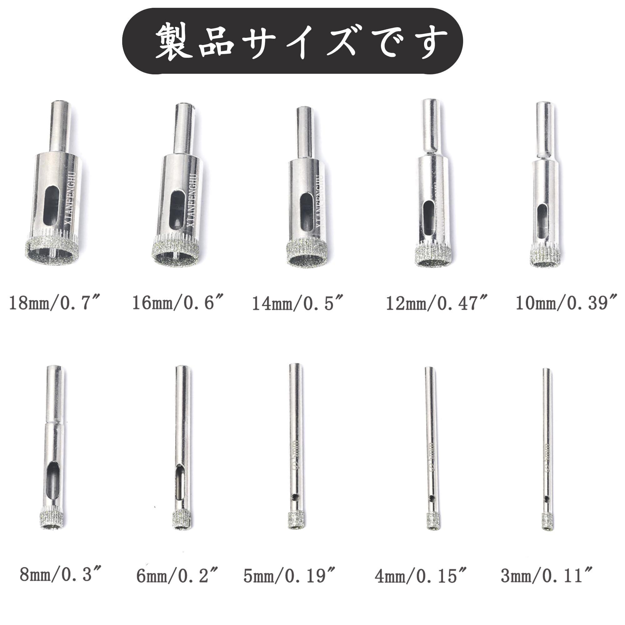 ダイヤモンドドリル サイズ 3mm、4mm、5mm、6mm、8mm、10mm、12mm、14mm、 16mm、18mm 常用サイズの10本をパッケージセットで提供いたします。