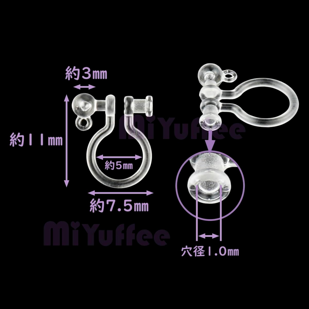 こちらの樹脂は、耐衝撃強度が強く、透明度も高く軽量です。樹脂素材は柔軟性があり、耳たぶの厚さに合わせて、調整ができます。クリアタイプなので、ピアスをつけているようでとても自然に見えます。金属アレルギーの方、ピアスの穴を開けていない方、通常のイヤリングが苦手な方、お子様にもオススメです。