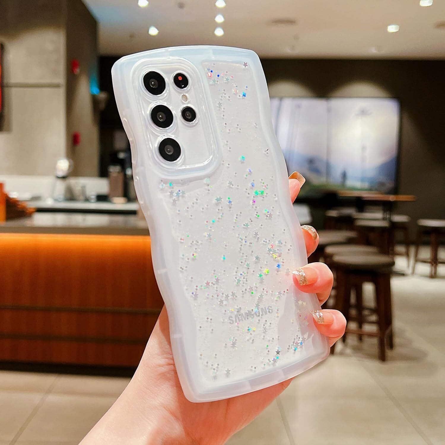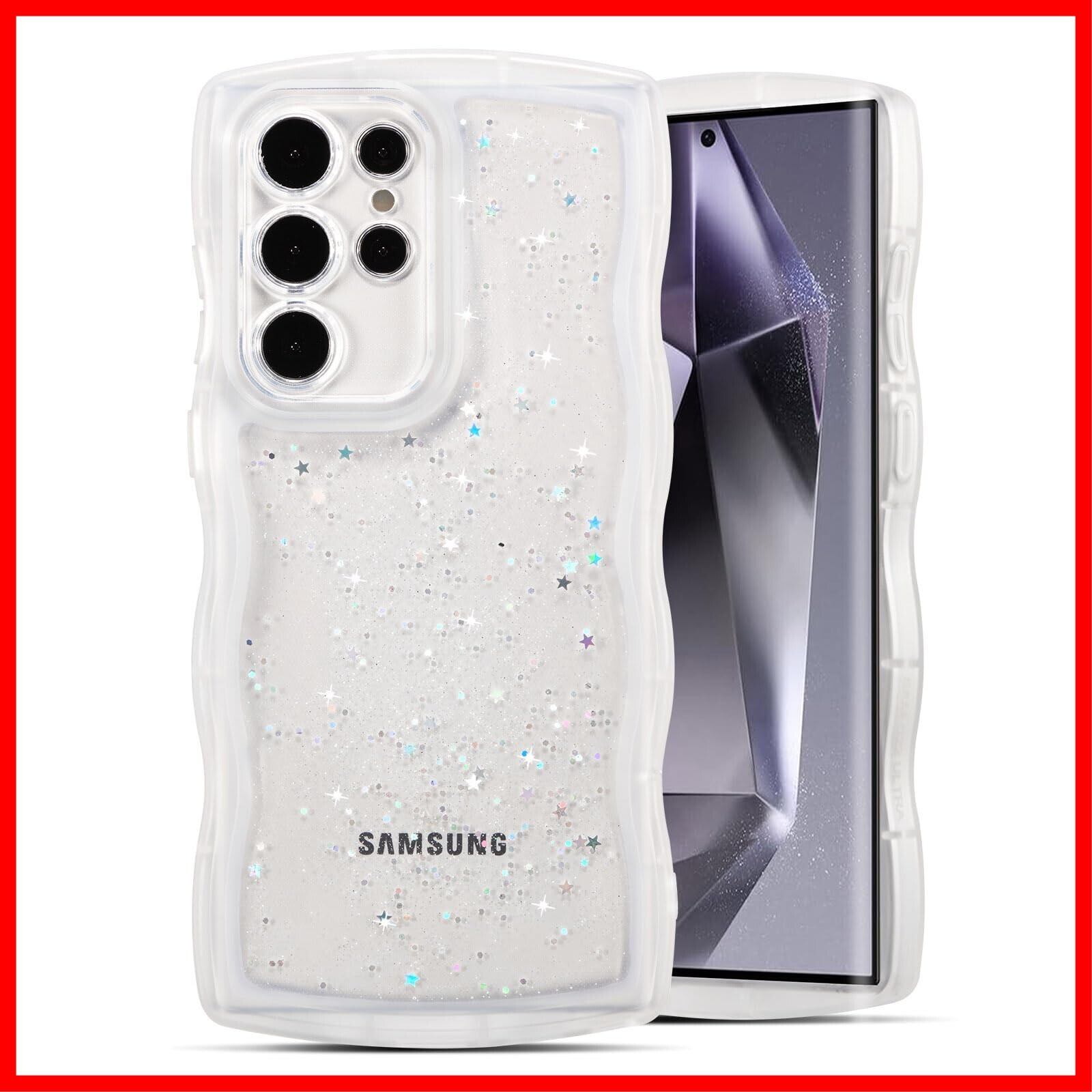 【透明感 ▪ フィット感】背面は透明度ポリカーボネートの素材で、Galaxy S24 Ultra本来の美しさと高級感をそのままに映り出し、埋め込まれている目を引くグリッターが剥がれ落ちたりしなく、あなたの携帯電話は、より美しさとファッションに見えるようにします。サイド周りのウェーブ部分は柔らかな素材のTPU素材で、デザインが手にフィットして持ちやすく、可愛い、流行りの韓国デザインです!