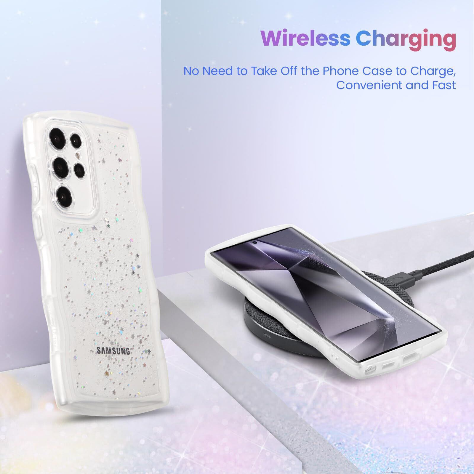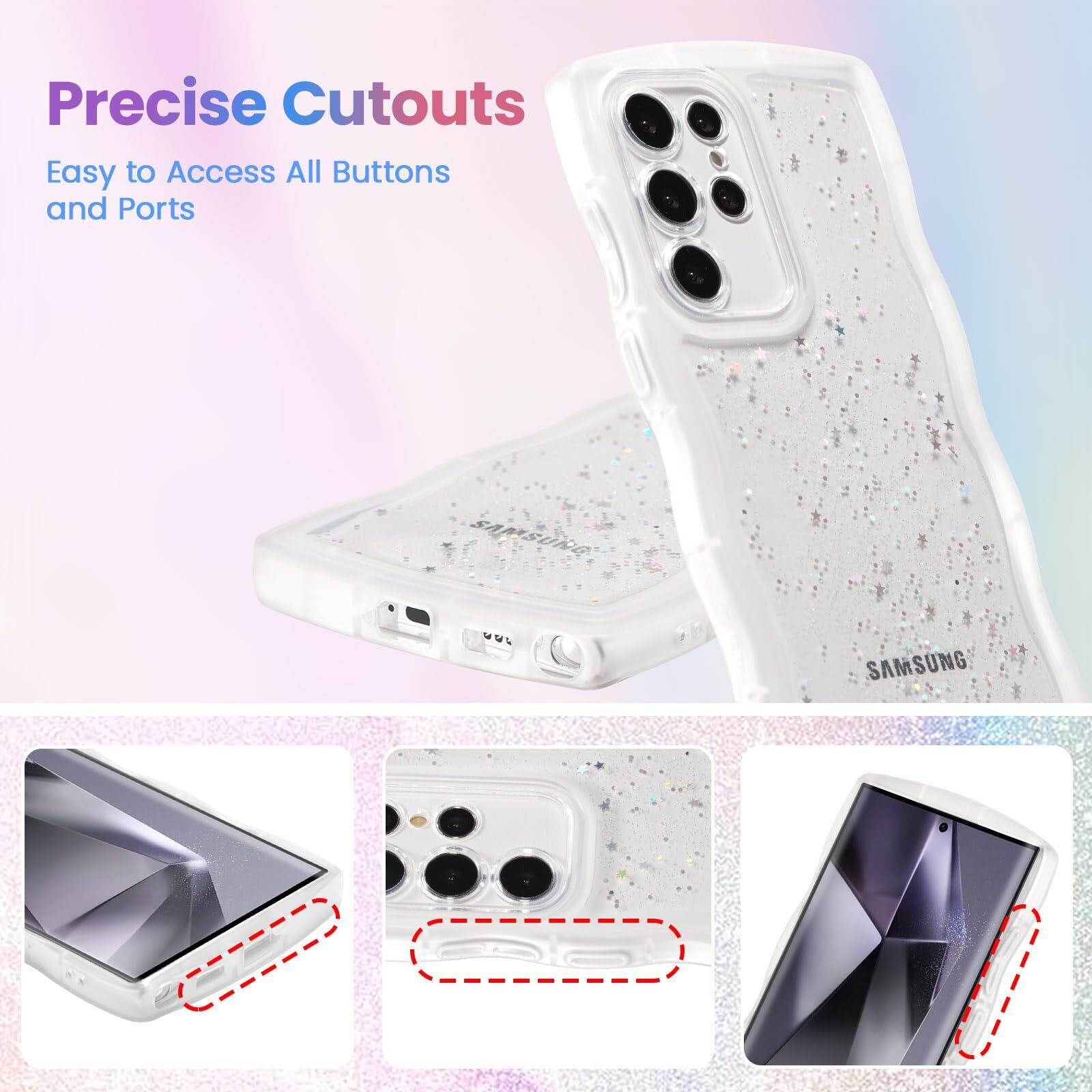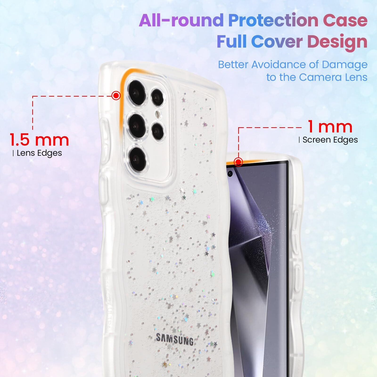 QLTYPRI Galaxy S24 Ultra ケース クリア TPU カバー ウェーブ おしゃれ 韓国 可愛い ウェーブ グリッター 透明 薄型 軽量 耐衝撃 滑り止め (SC-52E / SCG26) スマホケース ワイヤレス充電対応 ストラップホール付き ギャラクシーS24 Ultra ケース 6.8インチ 対応 - クリア