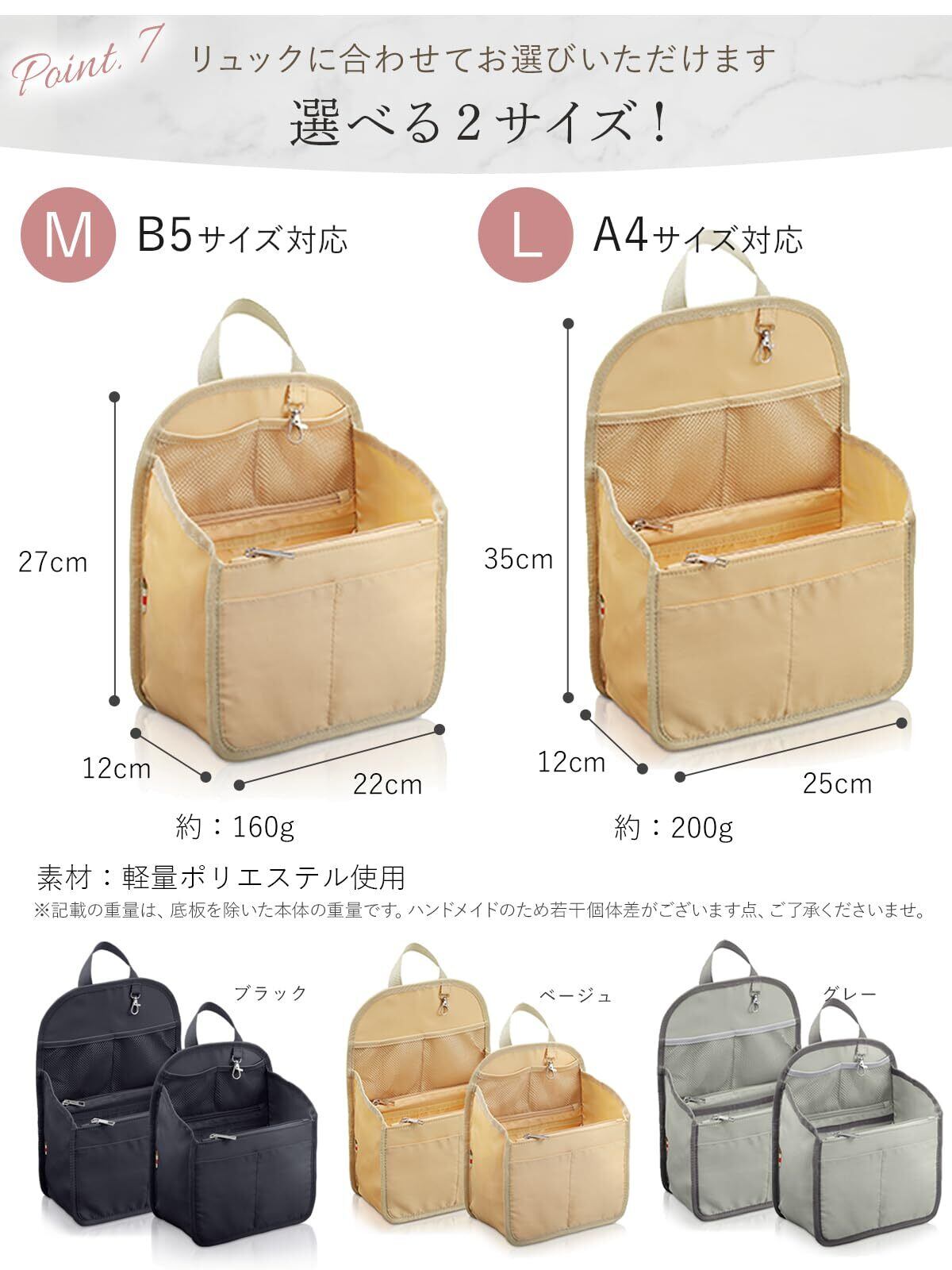 【16ポケット構造で徹底整理|収納のプロ監修】 累計2万個以上の販売実績を持つバッグインバッグシリーズから、待望のリュック対応モデルが登場。大小さまざまな16のポケットを備え、収納力と取り出しやすさを両立。A4サイズが入るLサイズと、B5対応のMサイズをご用意しています。