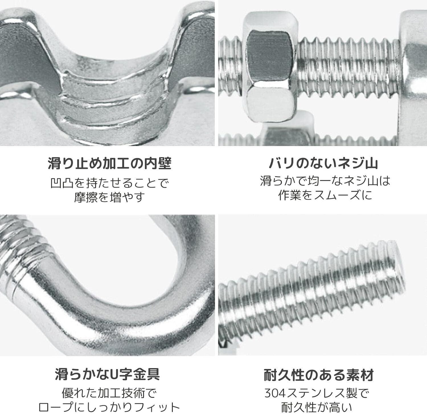 【滑り止め加工の内壁】凹凸を持たせることで摩擦を増やす【バリのないネジ山】滑らかで均一なネジ山は作業をスムーズに【滑らかなU字金具】優れた加工技術でロープにしっかりフィット【耐久性のある素材】304ステンレス製で耐久性が高い
