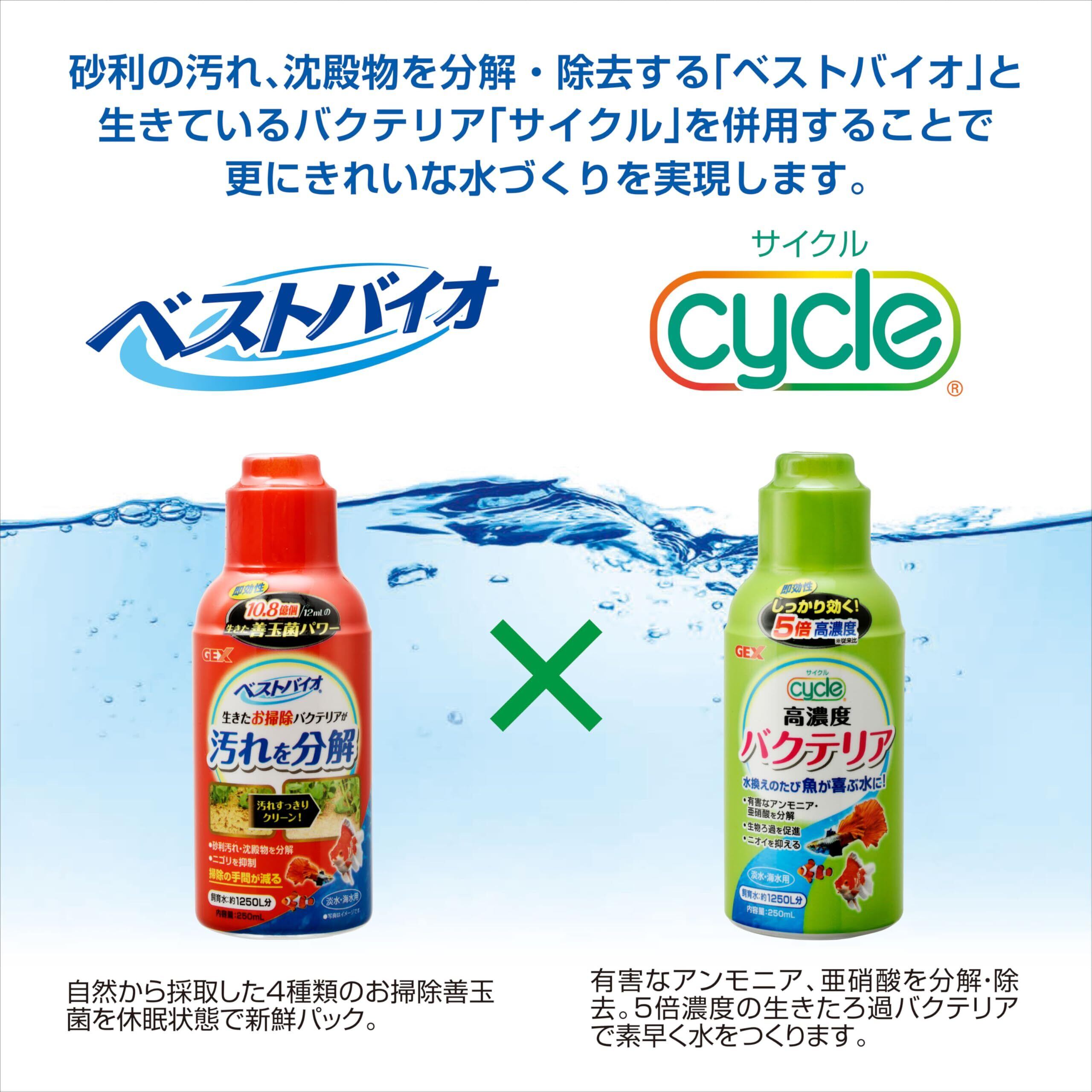 【ベストバイオ(別売)との併用でもっと効く!】 砂利の汚れ、沈殿物を分解・除去する「ベストバイオ」と生きているバクテリア「サイクル」を併用することで更にきれいな水づくりを実現できます。