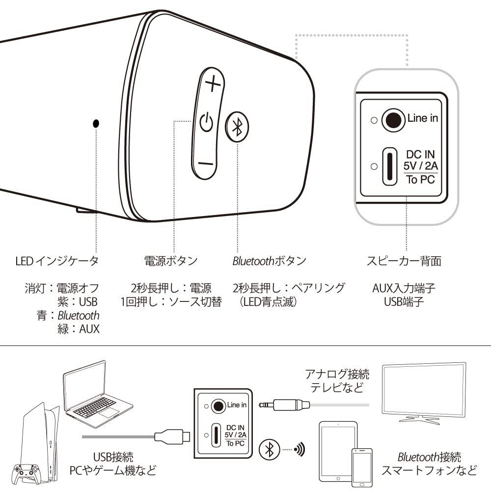 【ご注意:接続について】入力ソースは電源ボタンを押して切り替えます。各ソースは製品正面右にあるLEDの色でわかります。[青]Bluetooth / [緑]AUX / [紫]USB。AUX入力では、付属の3.5mmステレオ ケーブルを奥までしっかりと差し込んでください。Bluetooth接続でご利用の場合、まわりに混線する機器がない状況でご使用ください。PCとUSB接続する場合、PCの音声出力設定が「Creative Stage Air V2」になっているかご確認ください。