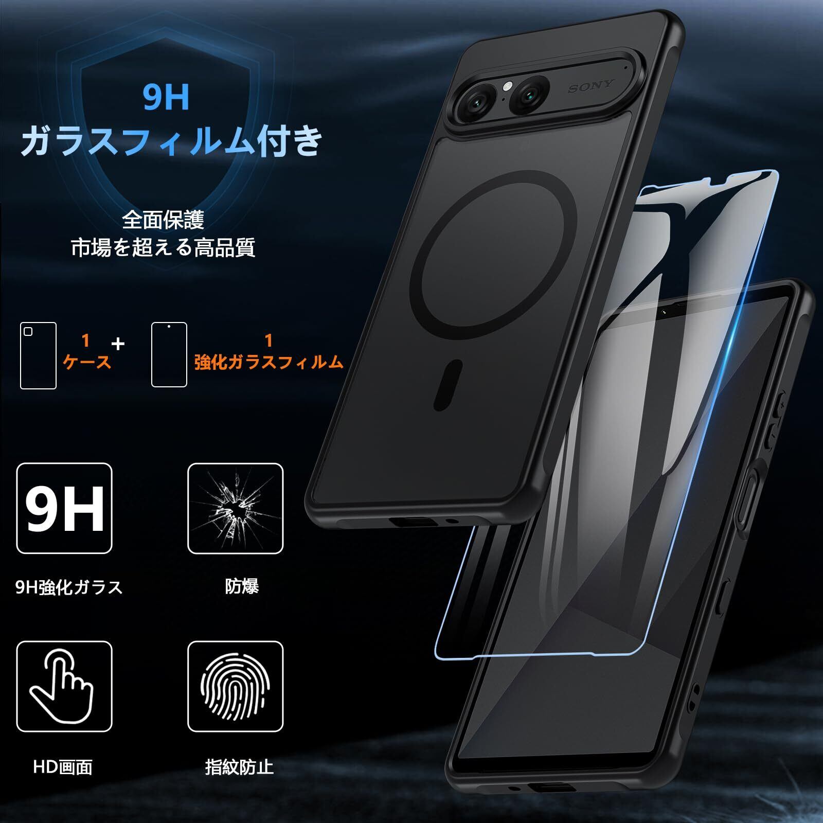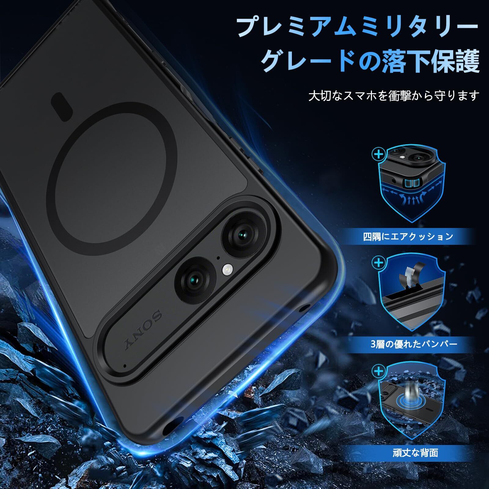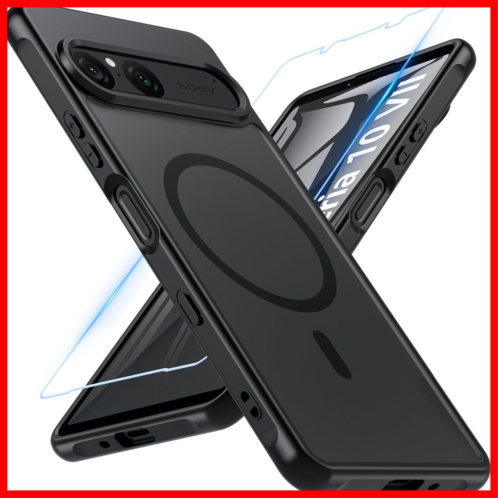 For Sony Xperia 10 Vii ケース【ガラスフィルム付き】MagSafe対応 半透明 耐衝撃 米軍MIL規格 黄変防止 指紋防止 ストラップホール付き Xperia 10 Vii カバークエクスペリア テン マークセブン ケース 6.1インチ (SO-52F / SOG16 / A502SO / XQ-FE44) ブラック