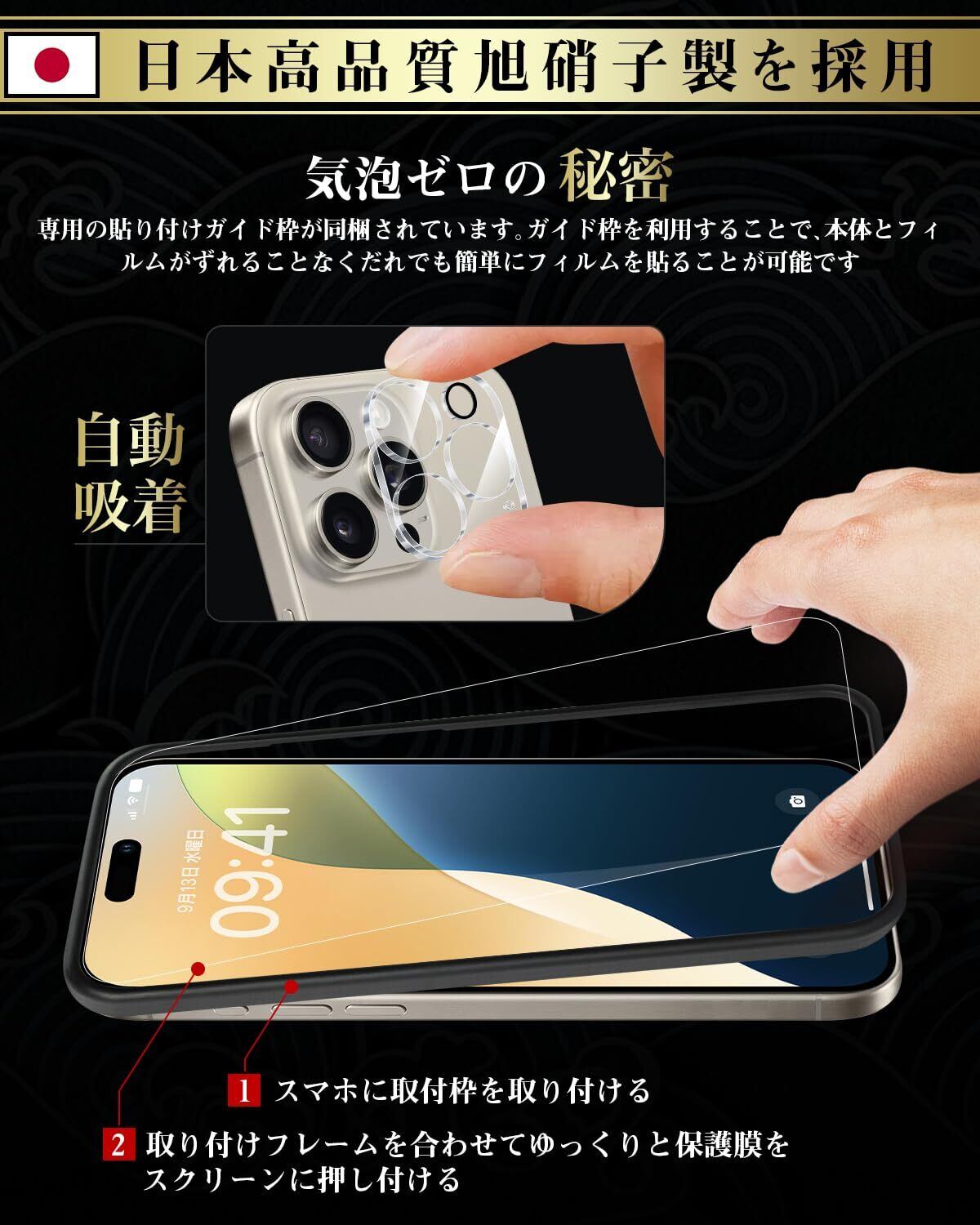 Boesklenn 対応 iPhone 16 pro ガラスフィルム (2枚)+対応 iPhone 16 pro カメラ保護 (2枚) 【旭硝子素材製-4枚入り】16pro フィルム 硬度9H 耐衝撃 高透過率 飛散防止 自动吸着 撥水撥油 16 pro レンズフィルム+ 16 pro フィルム + ガイド枠- 6.3'' | hananoki