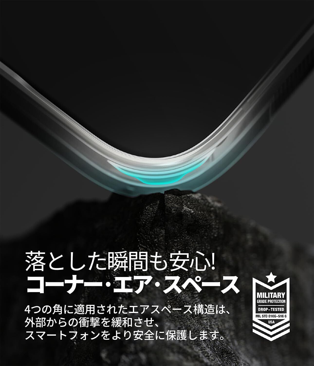【エアスペース設計】衝撃を吸収する角部分のエアスペース設計とクショニングを考慮した高弾性素材技術でスマートフォンを強力に保護します。