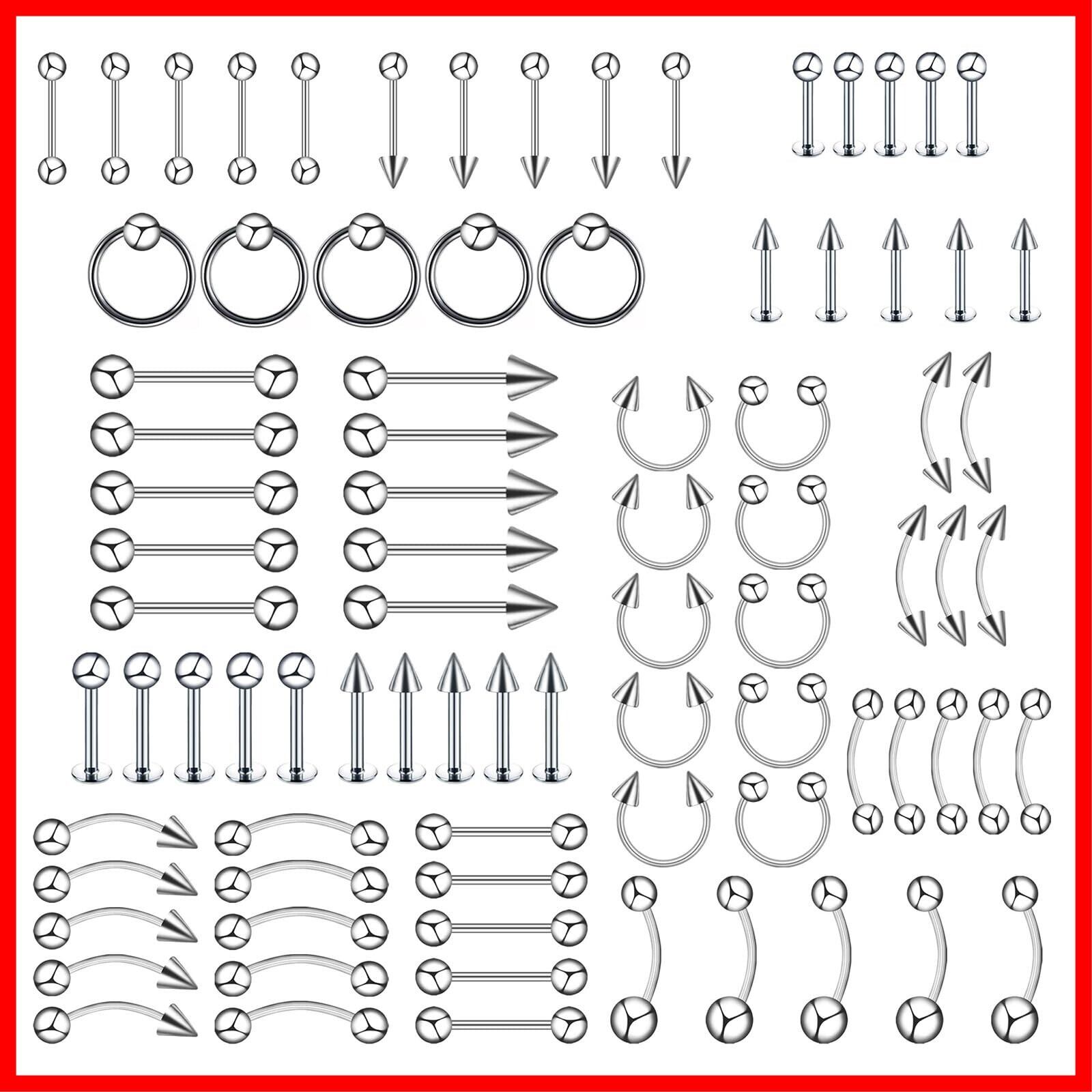 【お得な60点セット】 17種類85個ボディピアス、腹ボタンリング、ピアス、舌リング、フープノーズリング、馬蹄リング、眉毛ピアスなど。