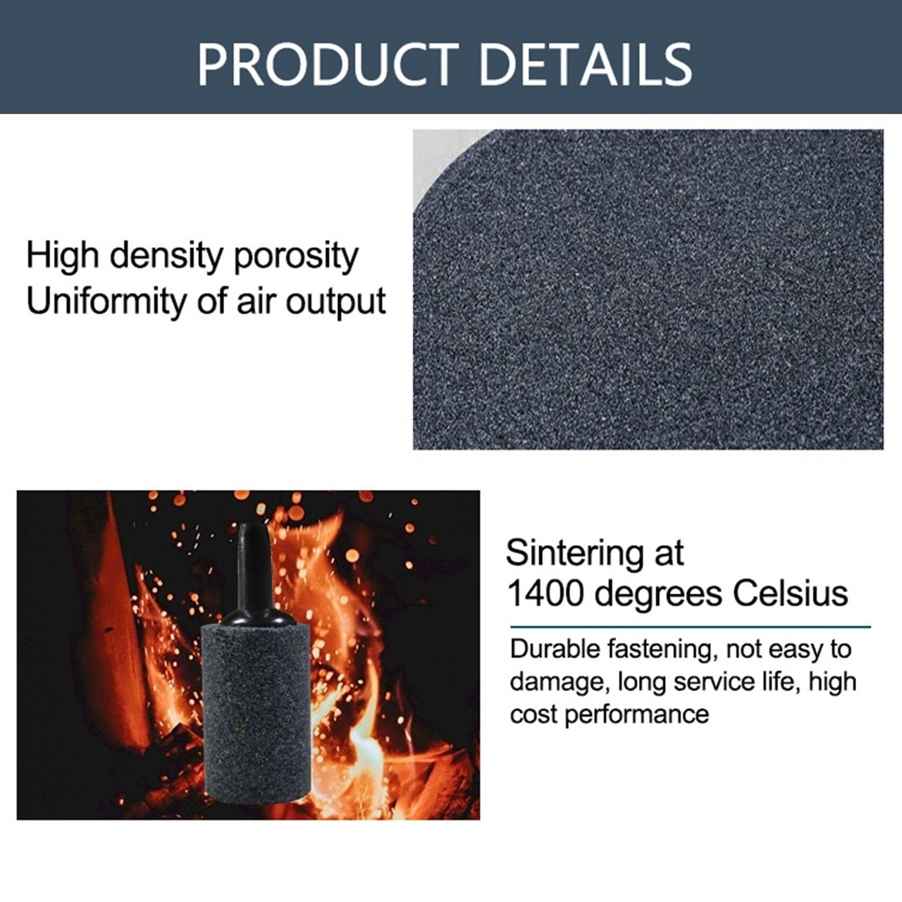 高密度の気孔により細かな気泡を均一に吐出させることができます。 1400℃の高温で焼結されたストーンは、耐久性に優れており高いコストパフォーマンスを実現します。