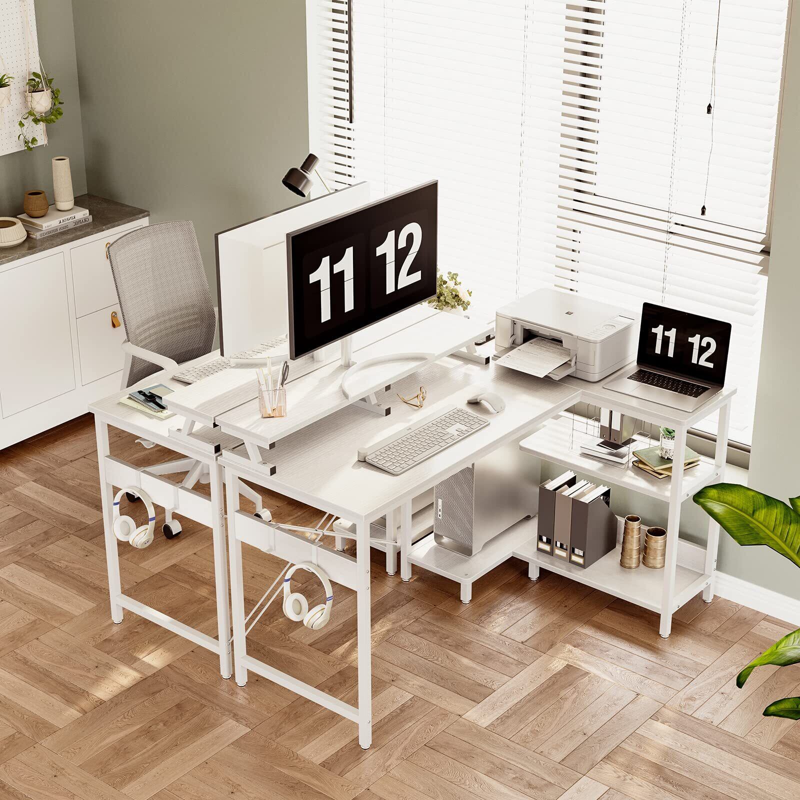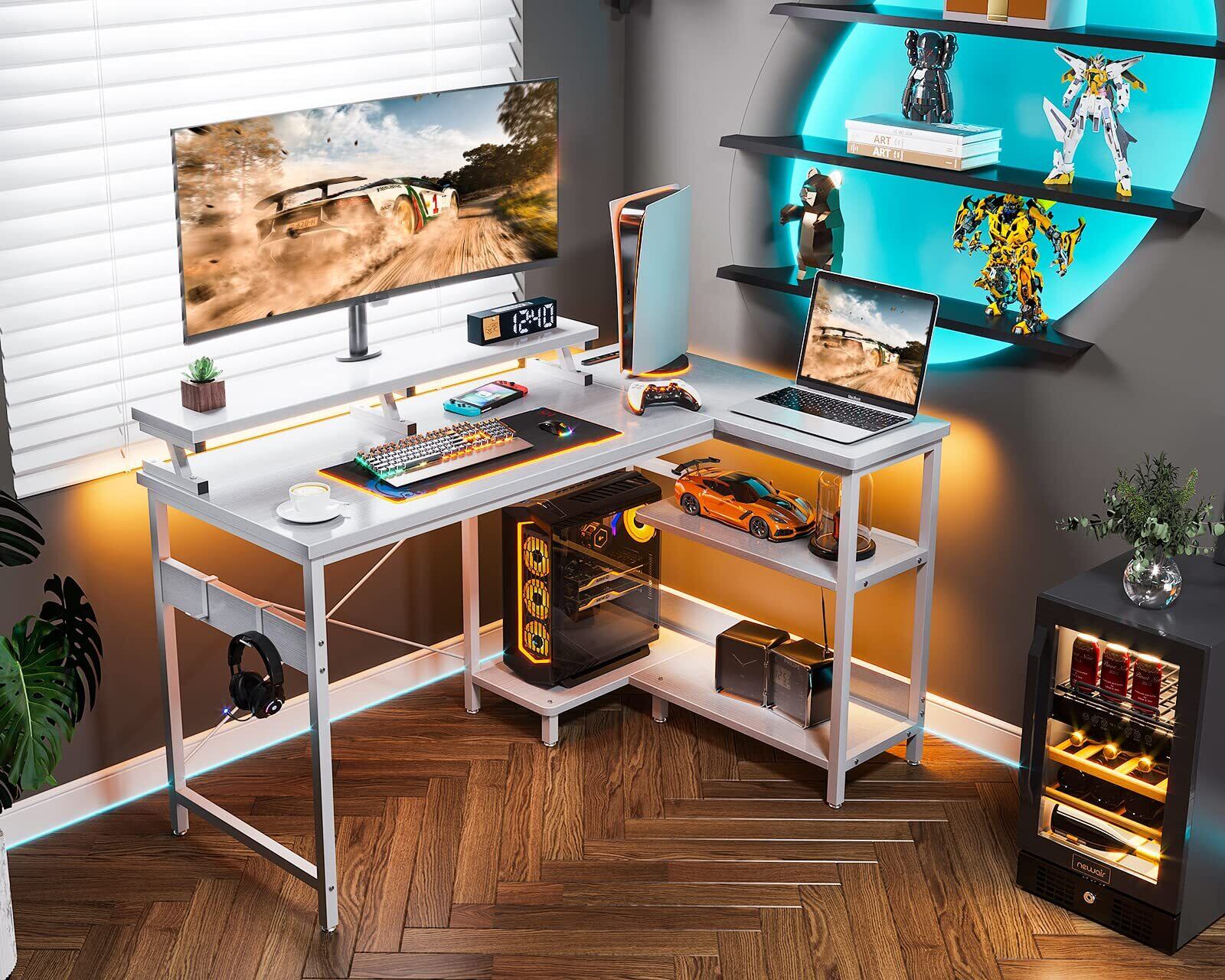 【ゲームと仕事両立】L字ゲーミングデスクは実用性が高く、ゲームプレイ、在宅勤務、勉強机、書斎机など様々なシーンで大活躍!お部屋のレイアウトに合わせてラックの位置を変更できます。モニター台を利用し、目線をあげて作業時の姿勢を改善し、テレワークが快適になり、作業効率も格段に上がります。
