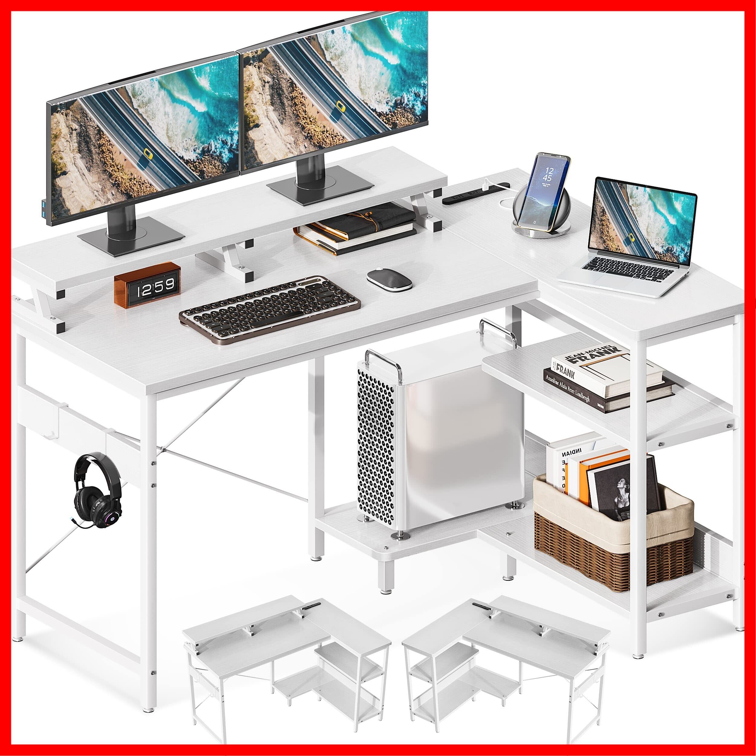 [ODK] l字デスク パソコンデスク L字型 ゲーミングデスク デスク 机 幅120cm pcデスク コンセント付き desk ラック付き 収納 オフィスデスク 省スペース 在宅勤務 組立簡単 書斎 ホワイト