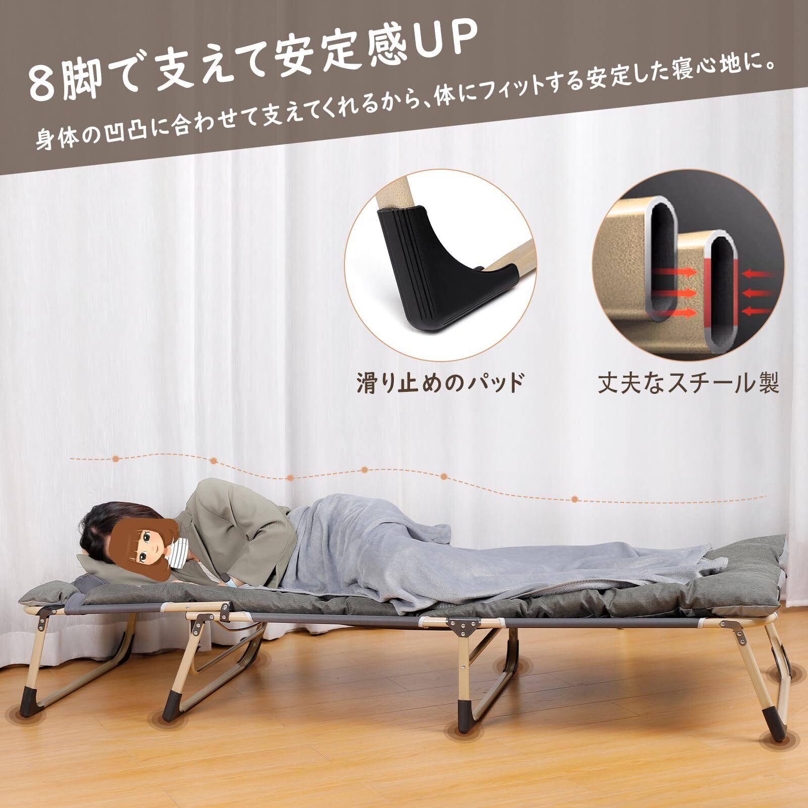 【耐久性と安定性】高密度防撕裂オックスフォード生地を使用し、耐久性が高く、長時間の使用にも耐えます。ベッドフレームは強固なスチールで作られ、高い安定感を提供します。人間工学に基づいたU字デザインで体にフィットし、快適な寝心地を実現します。さらに、防滑フットカバーが付いており、野外でも揺れることなく、快適かつ安定した休息を楽しむことができます。