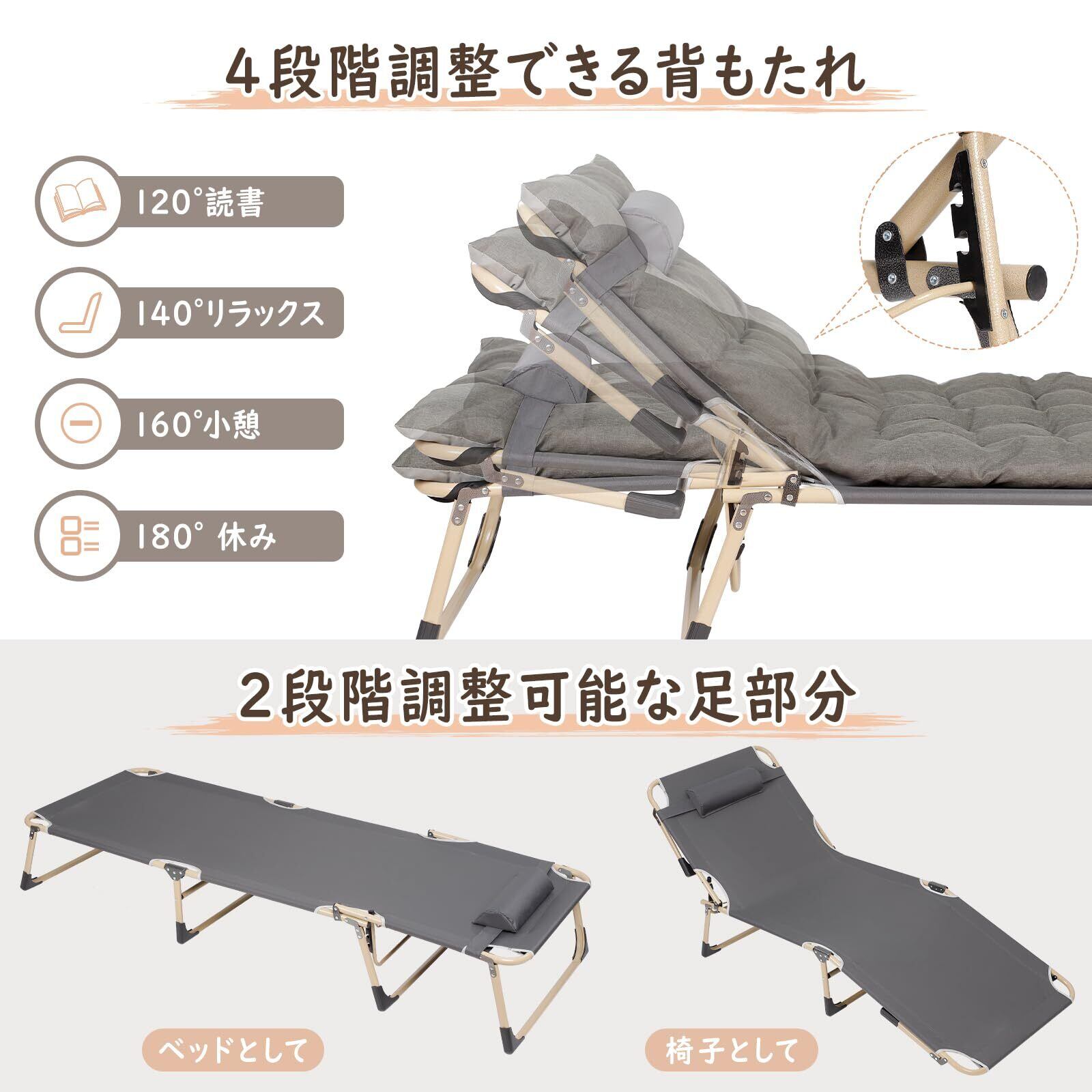 【4段階調節】背もたれは5段階の角度調節(120°/140°/160°/180°)が可能で、サマーベッド/ベンチ/ビーチチェアに変換でき、自由な角度調整で様々なシーンに対応します。取り外し可能な枕付きで、弾性バンドで固定することで、頭部をしっかりとサポートし、体圧を均一に分散させて、快適な座り心地を実現します。