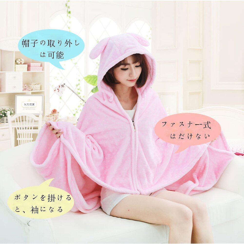 ファスナーの構造、はだけることなく体を暖める着る毛布です。帽子あり、取り外しは可能、ボタンを掛けると、袖になります。とても便利なデザインです。寝ても立っても動いても、暖かく着たままでいられます。