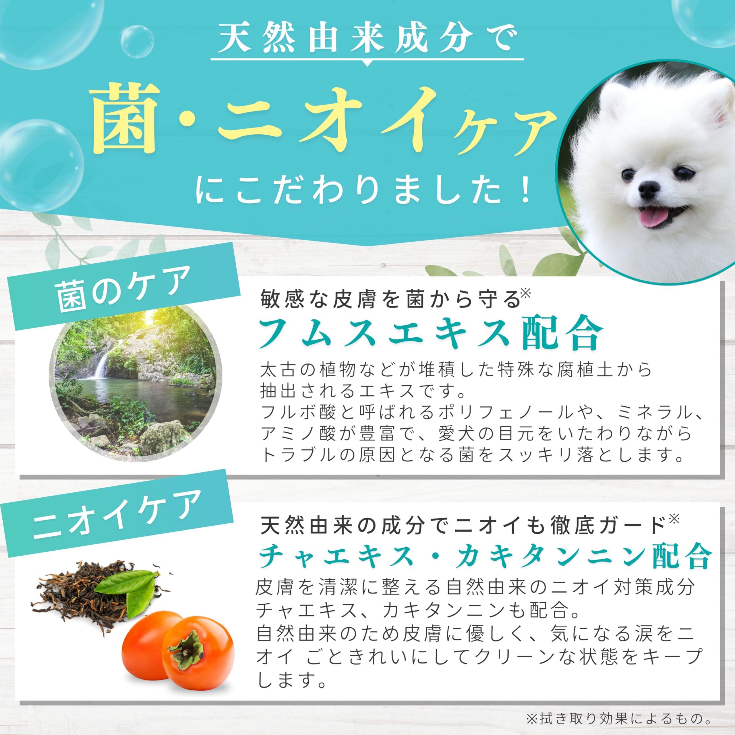 【涙やけをスッキリ拭き取り】目元の汚れやニオイが気になる涙やけを天然成分のフムスエキス、カキタンニン、チャエキスでスッキリ拭き取り。