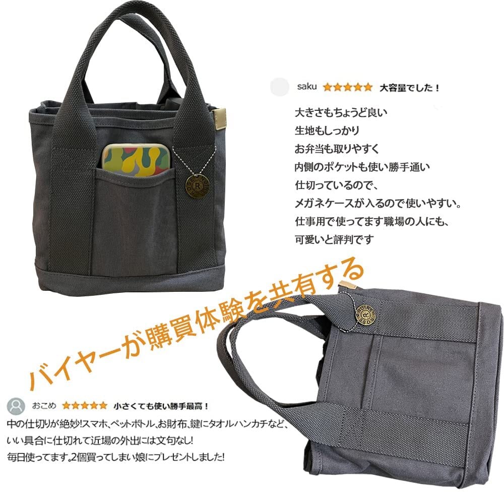 ヒント:外にはもう一つのポケットがあります。鍵、携帯などを置くことができます。ミニ トートバッグはお弁当箱やペットボトルがすっぽり入り、ランチバッグにピッタリ。