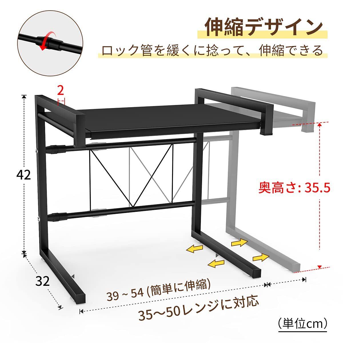 「2段式レンジ台」サイズ:42*32*39~54cm、レンジ上ラックは、伸縮タイプなので、幅35~50cm、高さ35.5cm以内のレンジに対応、2段式で、上に色々な調味料、キッチン電器が収納できます。